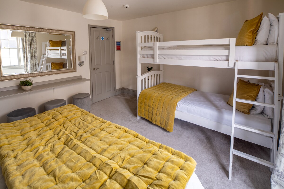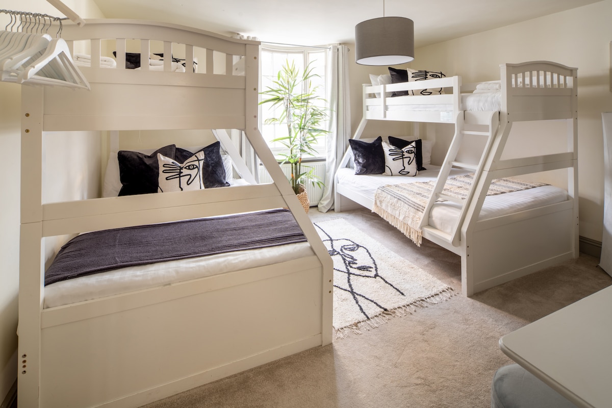 The second floor hosts bedroom four with a king bed and a set of single bunk beds, and two family bathrooms. One bathroom includes a double walk-in shower, while the second features a sleek white suite with a bath, ensuring plenty of space and comfort for all guests. On the third floor, Bedroom Five has a king bed and a single bed, bathed in natural light from dual-aspect windows.