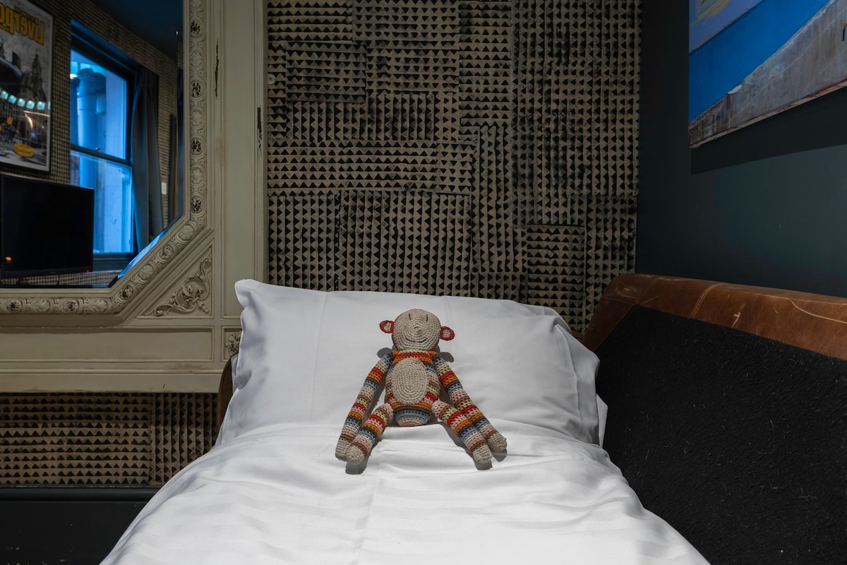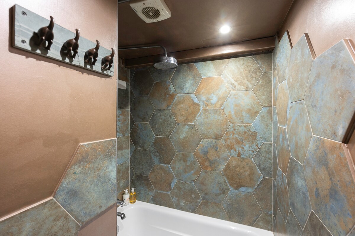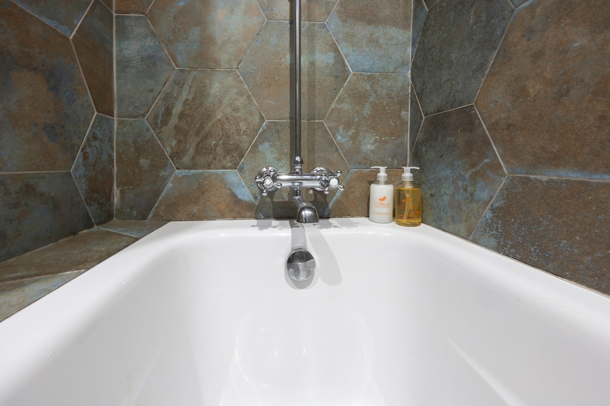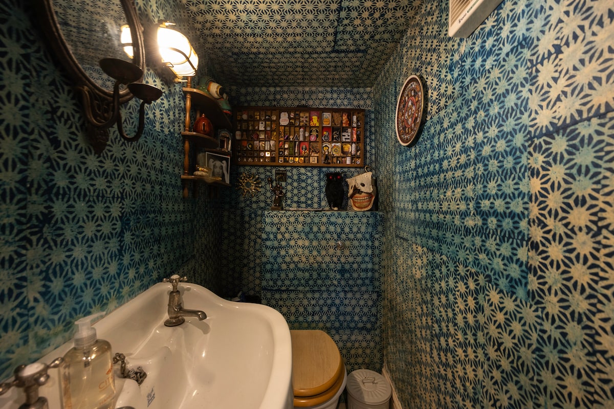 The toilet is adorned with hand-printed blue batik wallpaper, a creation by the illustrious French designer Le Monde Sauvage. Each corner whispers tales of curiosity, marked by intriguing ornaments that paint a vivid picture. The separate bath room beckons you to immerse yourself into a deep relaxation in the bath, with an overhead shower. Plenty of big bath towels, hand towels and toiletries are provided.