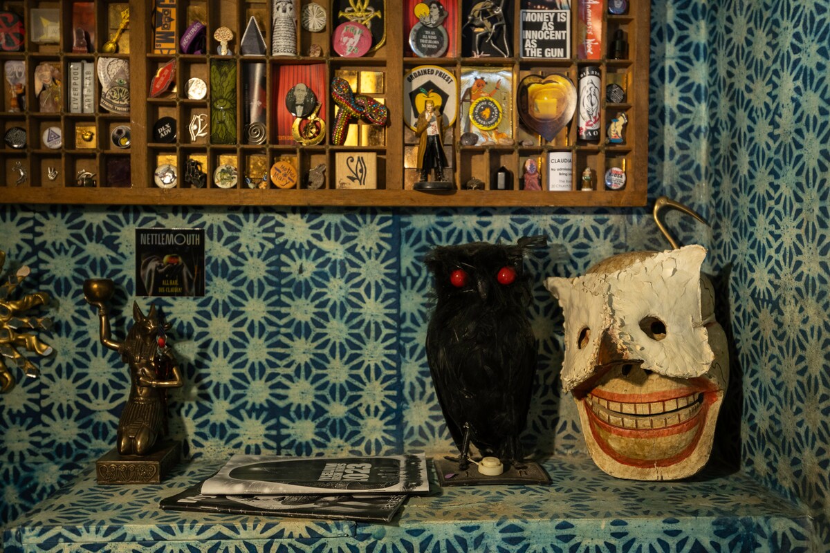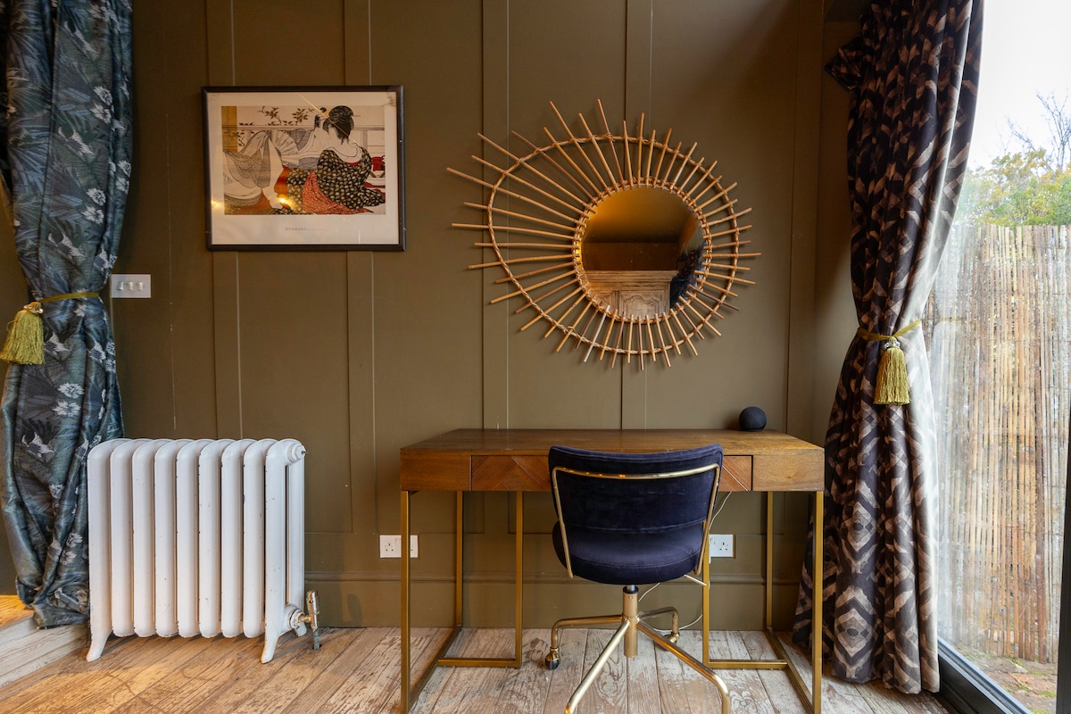 A small desk awaits those inspired to work, write, or dive into a world of creativity.