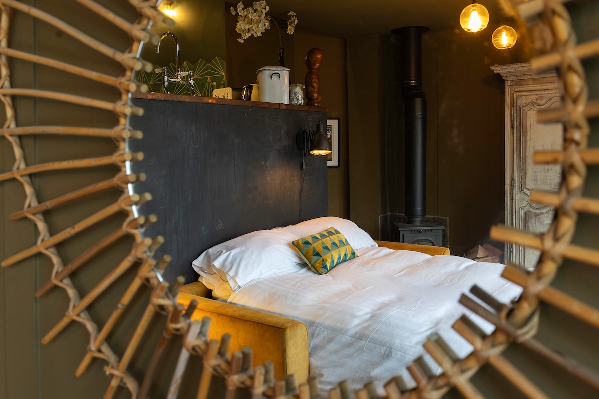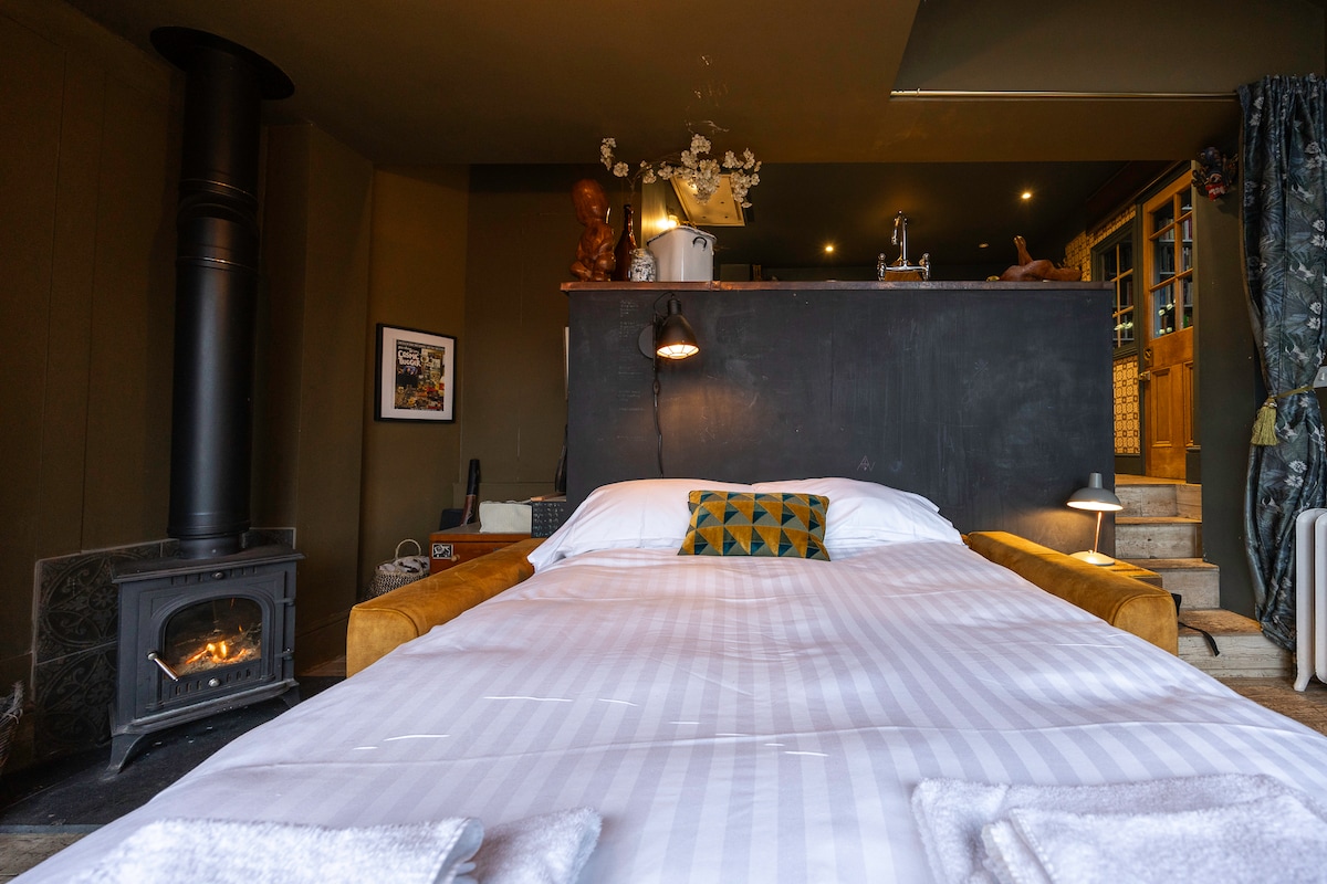 The bedroom, a sanctuary of enchantment, features a super comfy sofa bed with a full-sprung mattress from the renowned British company Furl. Embrace the magical ambiance further with a woodpecker log burning stove, promising cosy nights. Plenty of fresh bed linens are provided. Please note a £20 fee will be charged if you require firewood.