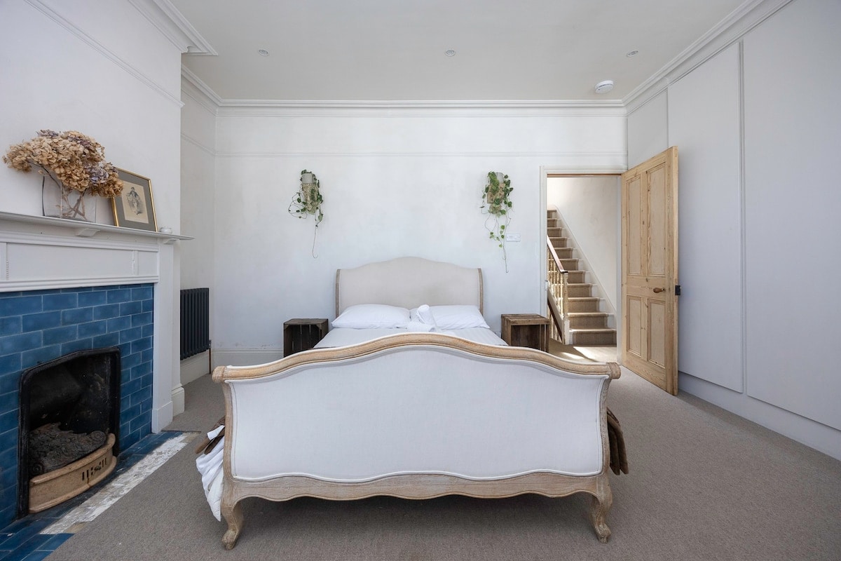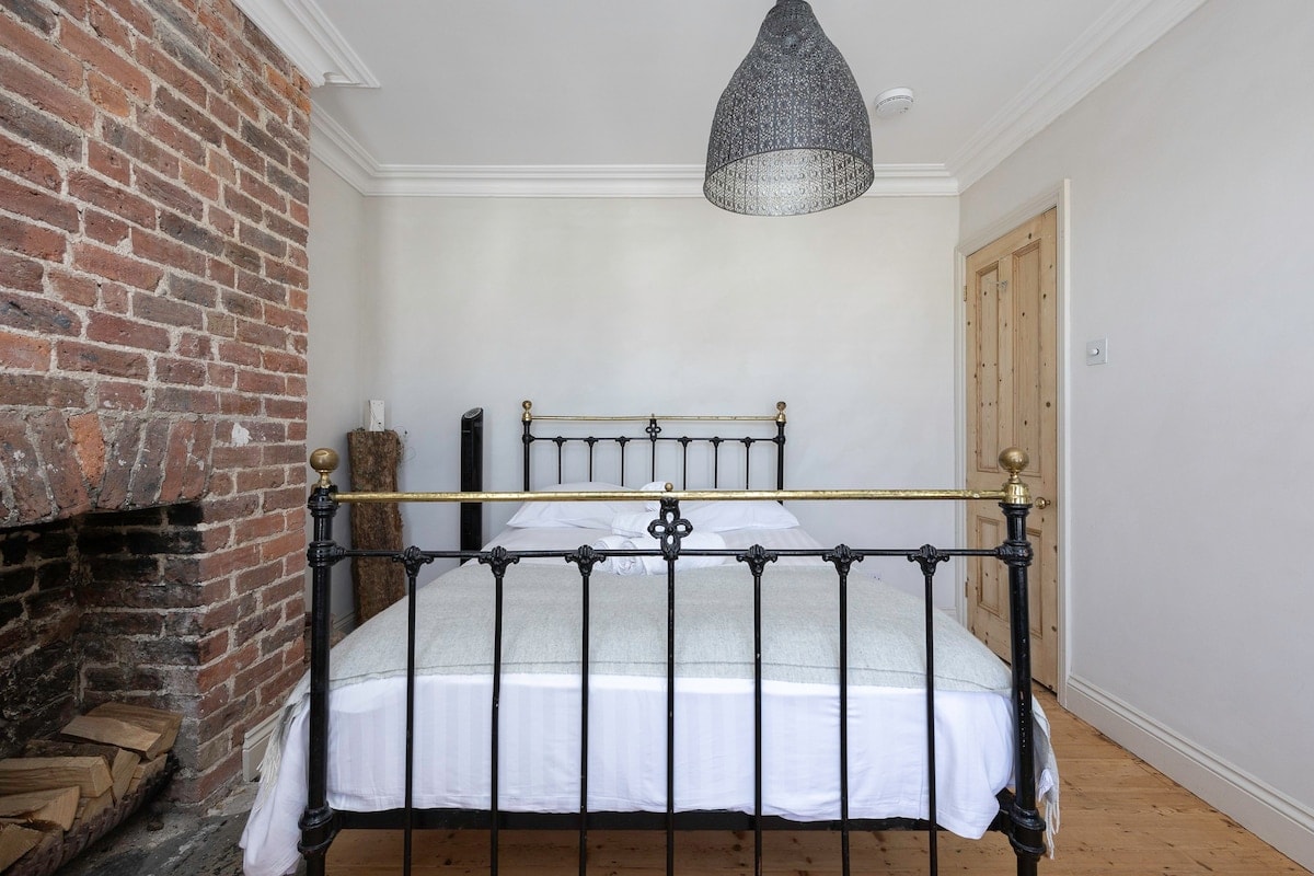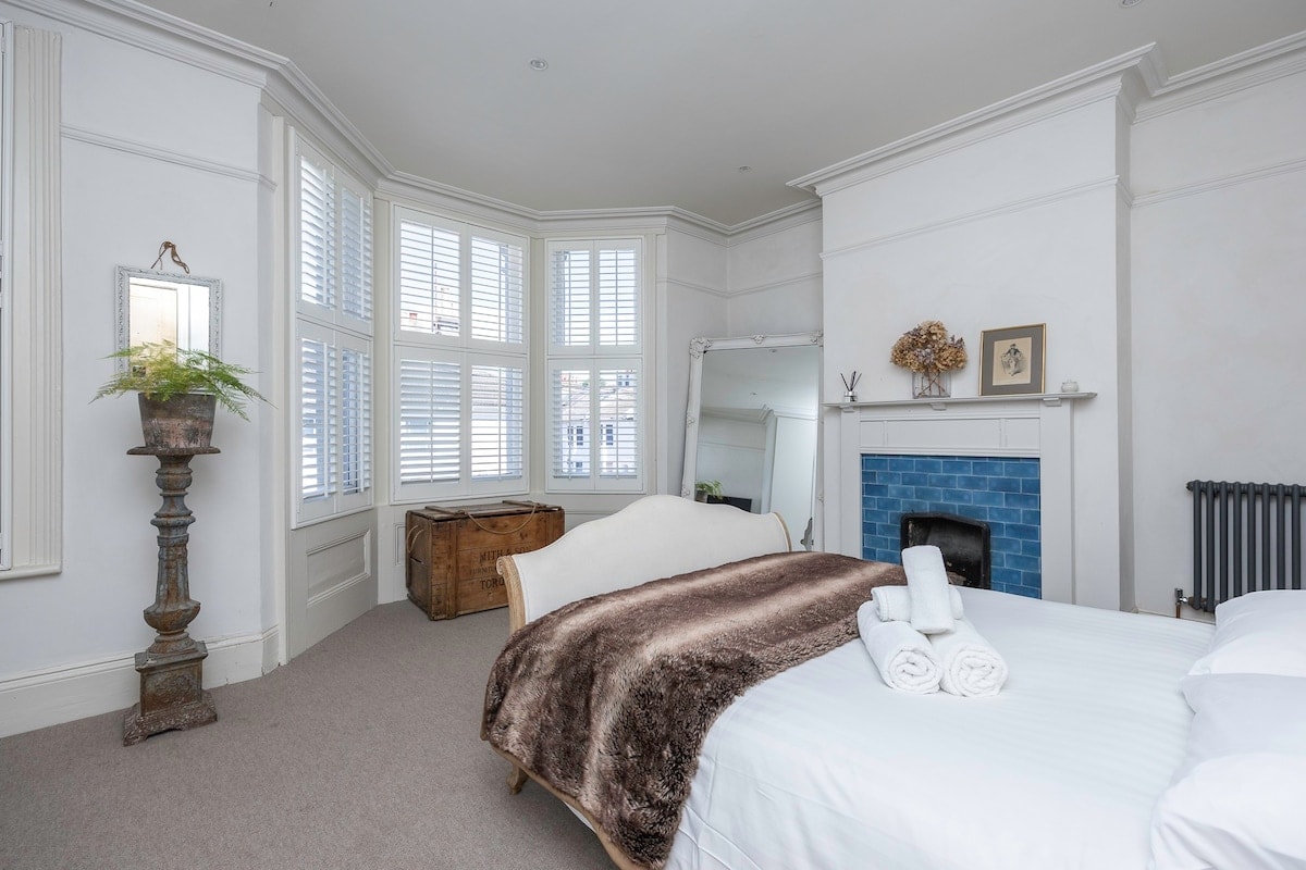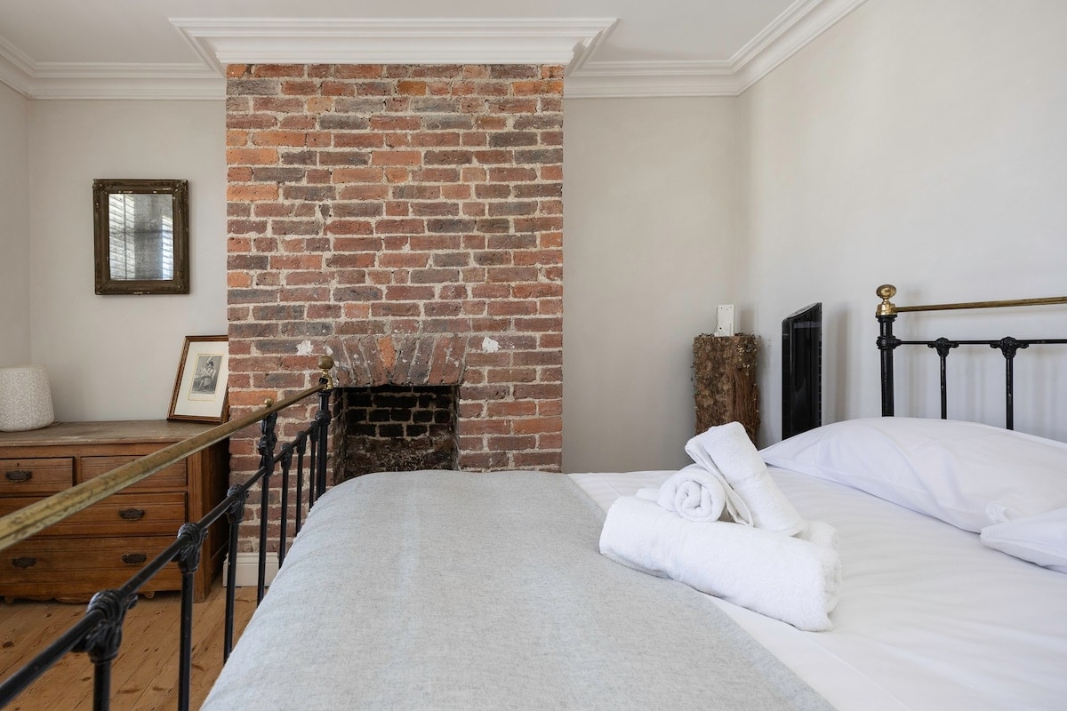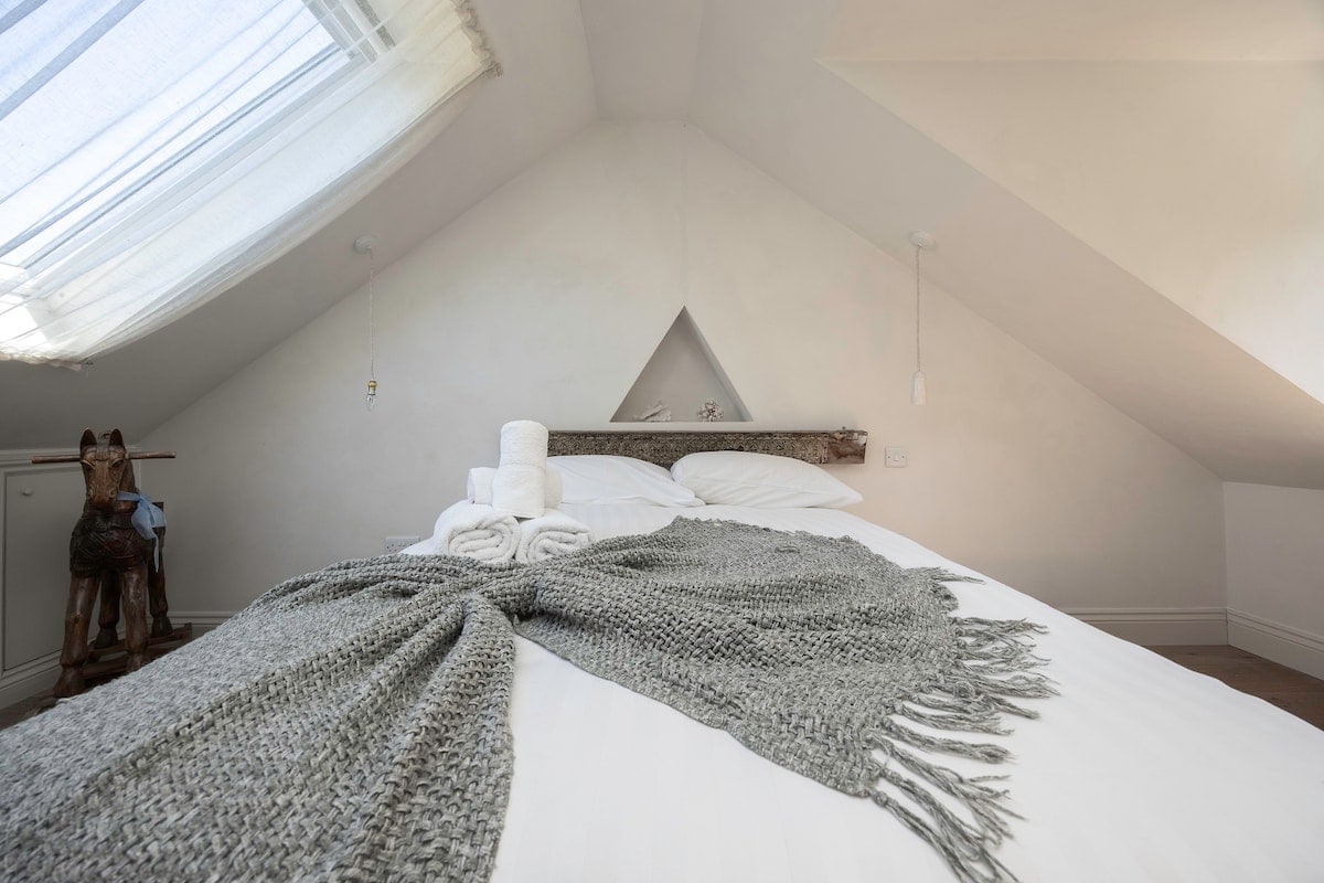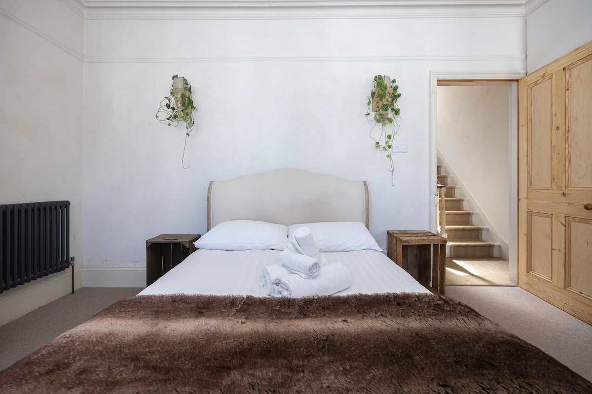 The master bedroom features a super comfy king size bed with a full-sprung mattress, ideal for a great night's sleep. The gorgeous bay window floods the room with natural light. No need to worry about over-packing; the storage is not lacking! A small desk awaits those inspired to work, write, or dive into a world of creativity. Plenty of fresh bed linens are provided.
