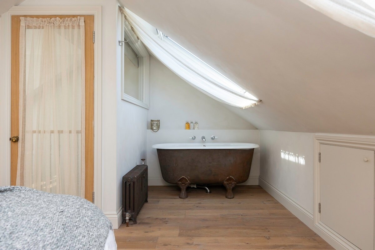 Bedroom three is a cool loft space comprising a cosy double bed, storage facilities and a sumptuous roll top bath! Offering extra privacy, this room is a loft room.