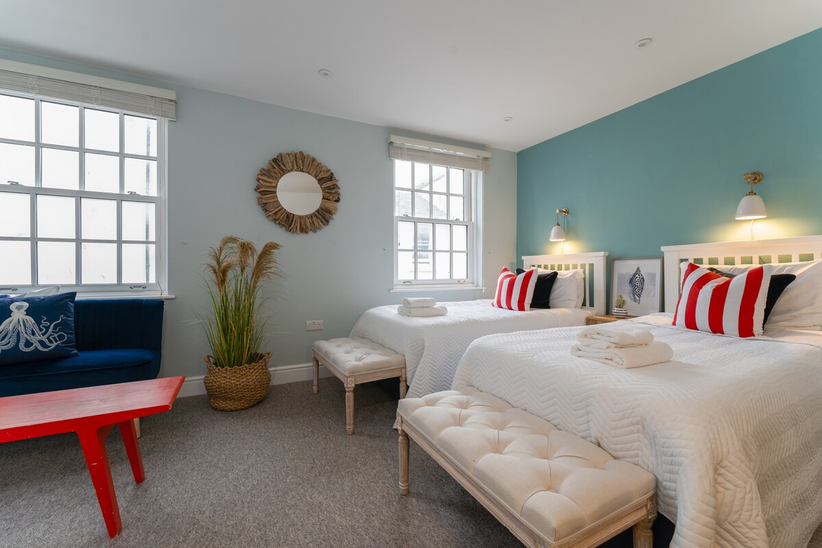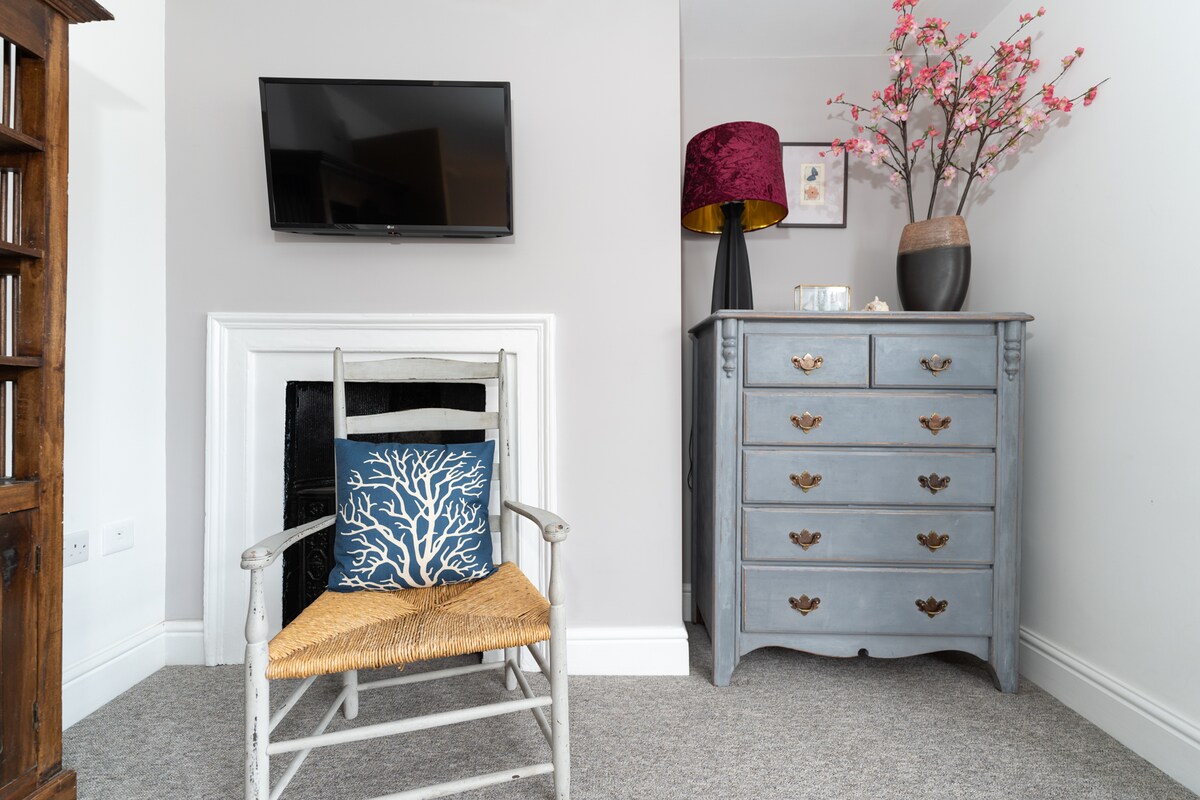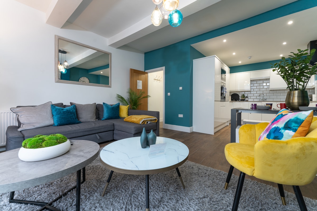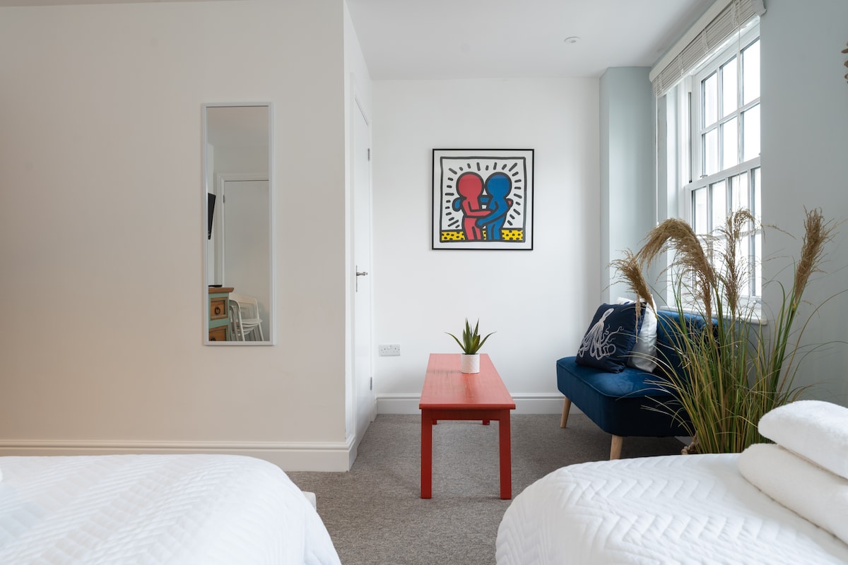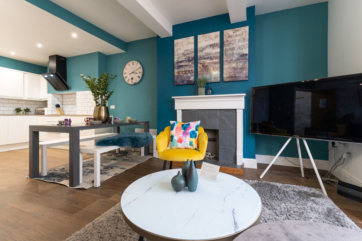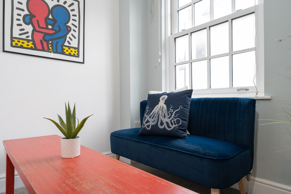 The living space has a big L-shaped sofa, custom window bench seating and a dining table where all 10 guests can sit together and enjoy brunch or drinks. The sofa can be converted to a sofa bed, fit for 2 guests. The large Smart TV has access to Sky, Netflix and Disney+ and there's fantastic Wi-Fi too.