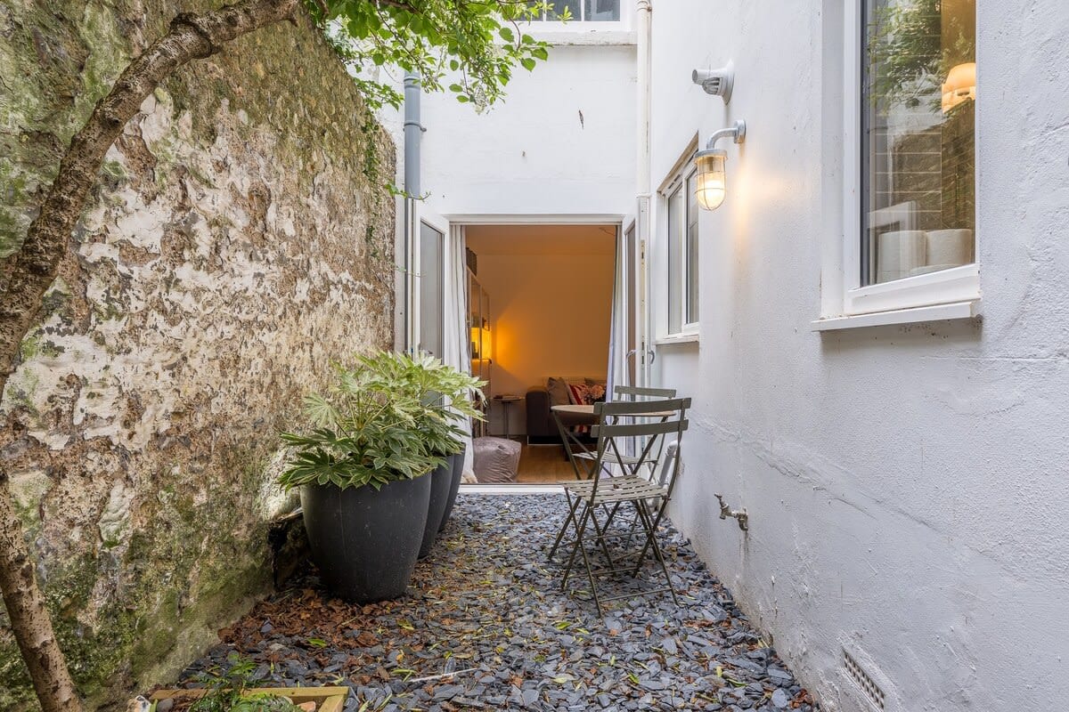 In the evenings relax and unwind with a glass of wine in the cosy lounge area with a large corner sofa with flatscreen wall-mounted TV or in the mornings watch the world go-by with a coffee in the courtyard which is accessible from the French doors that illuminate and cast dappled light into the space.
