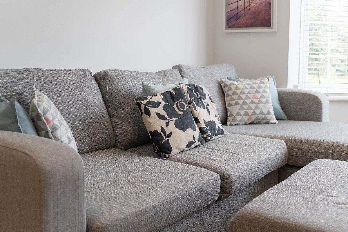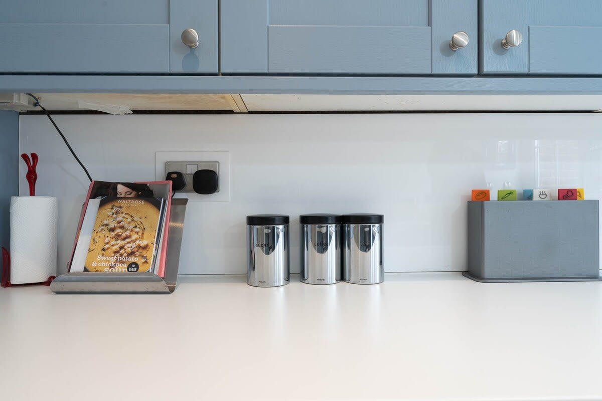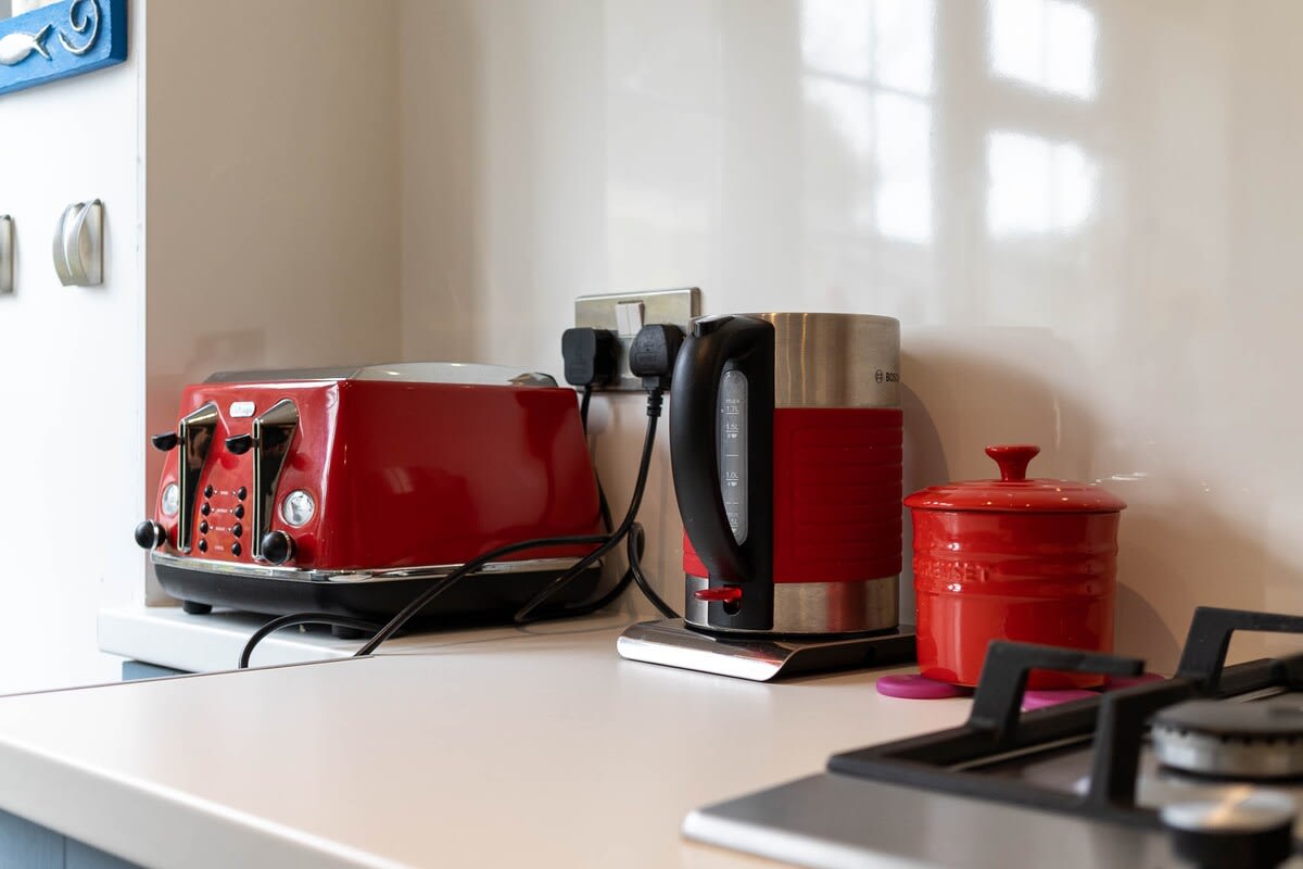 The contemporary powder blue fully equipped kitchen features plenty of cookware, crockery, glassware, and cutlery, along with a dining table for enjoying meals. There is also a kettle and toaster, dishwasher and microwave for guest convenience, plus a washing machine and tumble dryer.