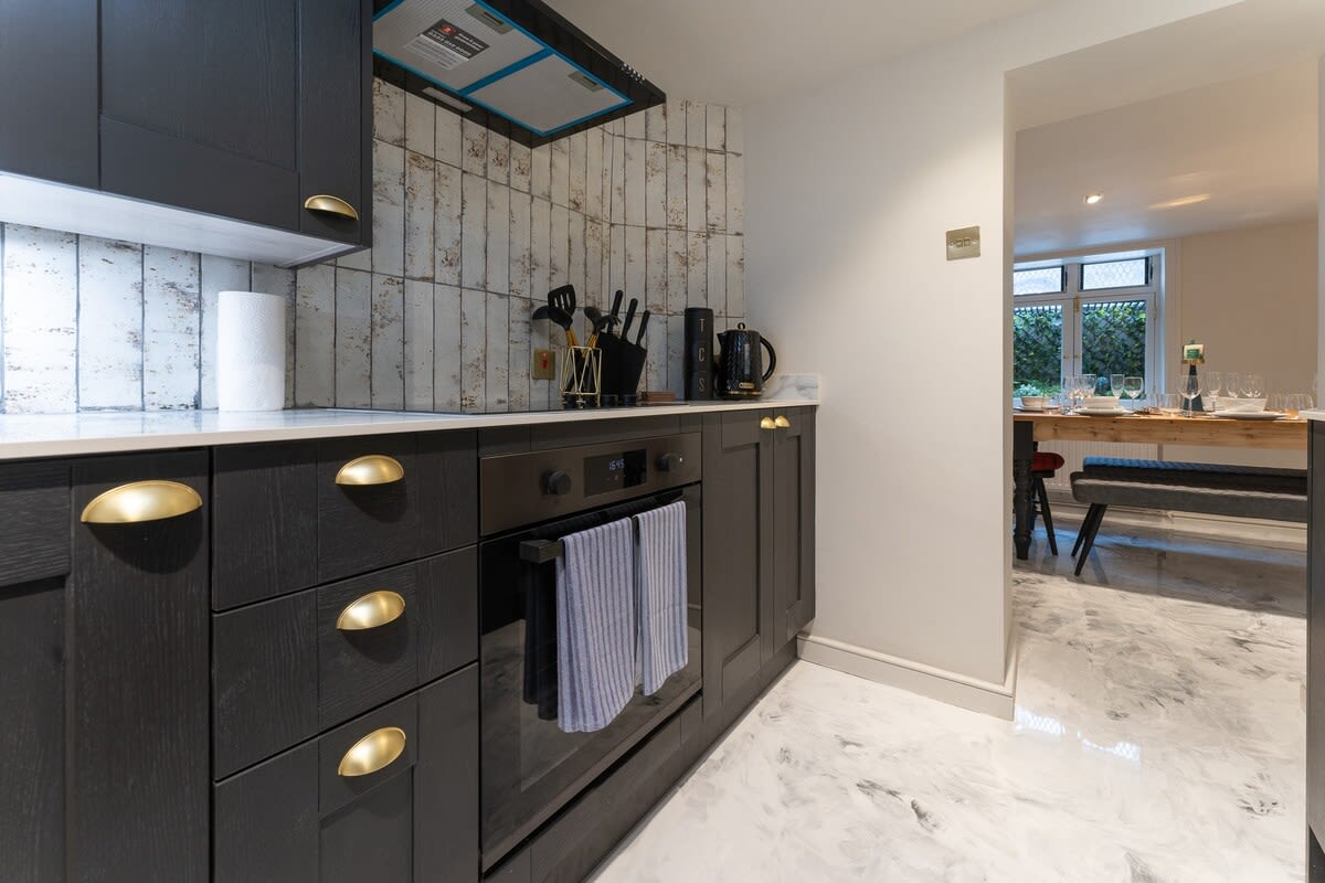 The house has just undergone a complete makeover, from top to bottom, including new flooring, paint, and furniture. The attention to detail throughout the house is fantastic and creates a luxurious feel, from the navy blue kitchen with gold handles and contemporary tiles to the marble effect floor in the dining room.
