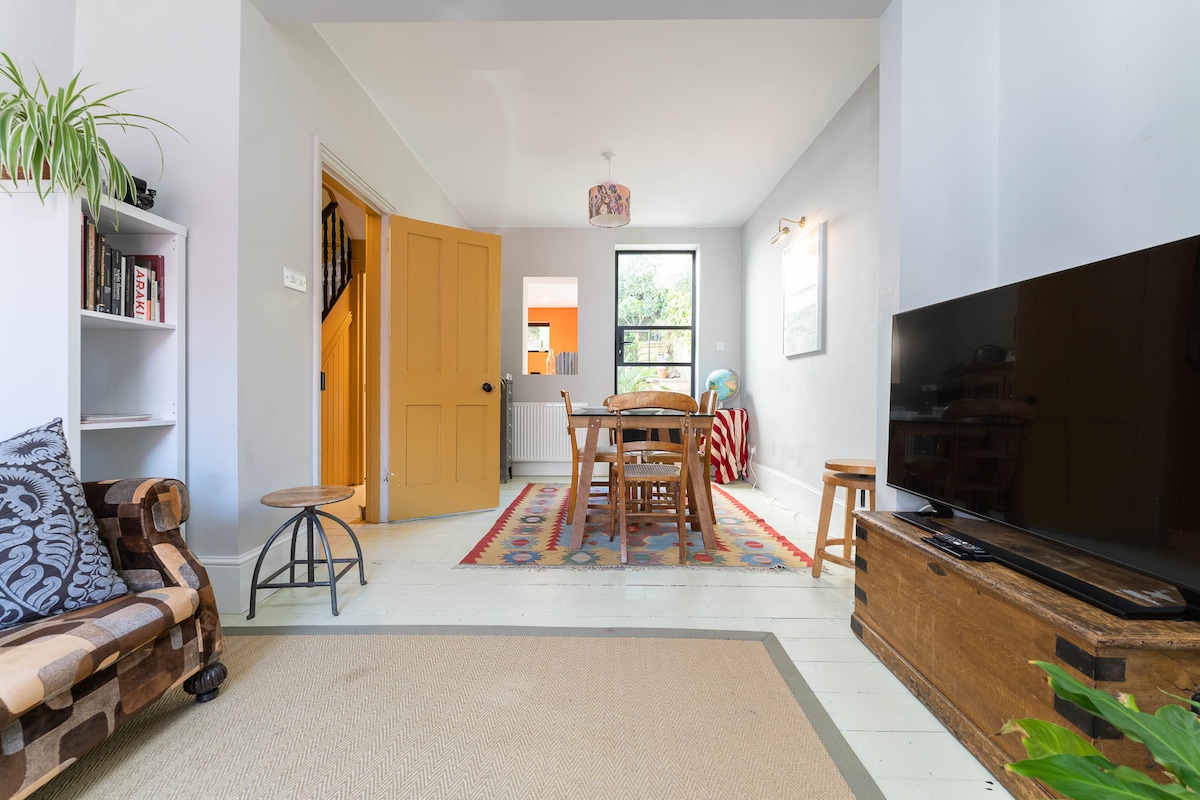 This terraced townhouse, nestled in a quiet residential area, is ideally located for exploring Brighton’s best spots. You’ll be within walking distance of the city center, the beach, the iconic Lanes for shopping, and Brighton train station. Nearby, you’ll also find some fantastic local pubs, perfect for enjoying a relaxed evening out.On the ground floor, the spacious living room invites you to unwind with a cozy sofa, two matching armchairs, a Smart TV, wooden floors, and a soft rug. It’s a welcoming space for spending time together or enjoying a quiet movie night. The living room flows seamlessly into the dining area, where a table comfortably seats up to six guests, perfect for family meals or brunch with friends.