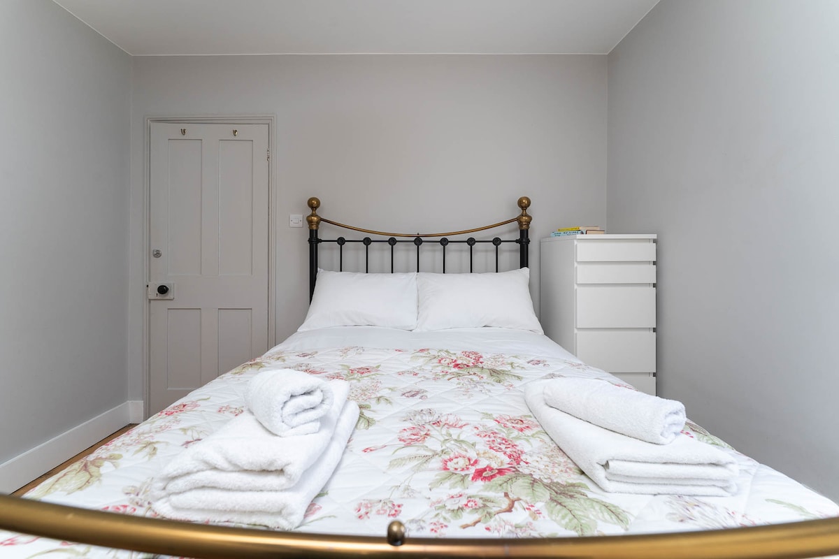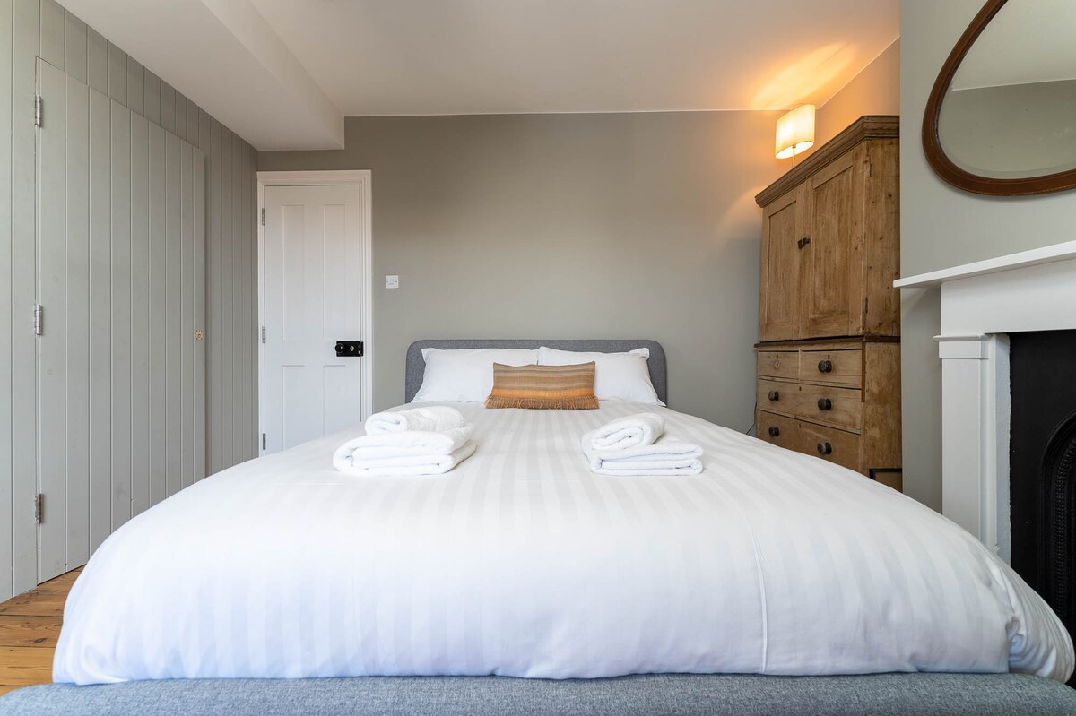 On the first floor, you’ll find two bedrooms. The main bedroom features a king-size bed, wooden floorboards, an original fireplace, storage space for luggage, and a desk, perfect for those needing a workspace. The second bedroom has a comfortable double bed and storage for personal items. Fresh bed linen, large towels, hand towels, bath mats, and guest toiletries are provided. The bathroom on this floor is a standout feature with relaxing blue hues, a freestanding roll-top bath, and a tiled walk-in shower, offering a serene space to relax and unwind.