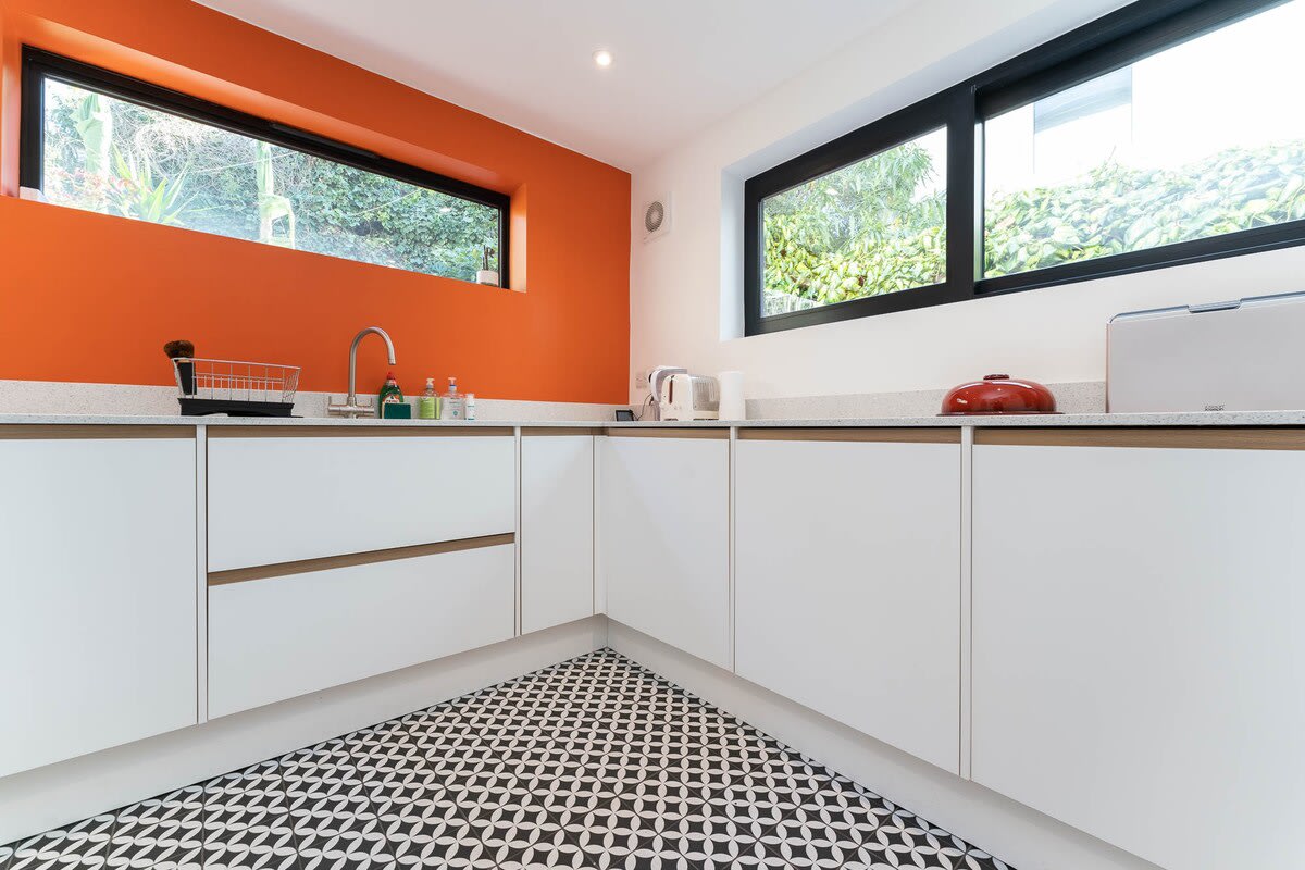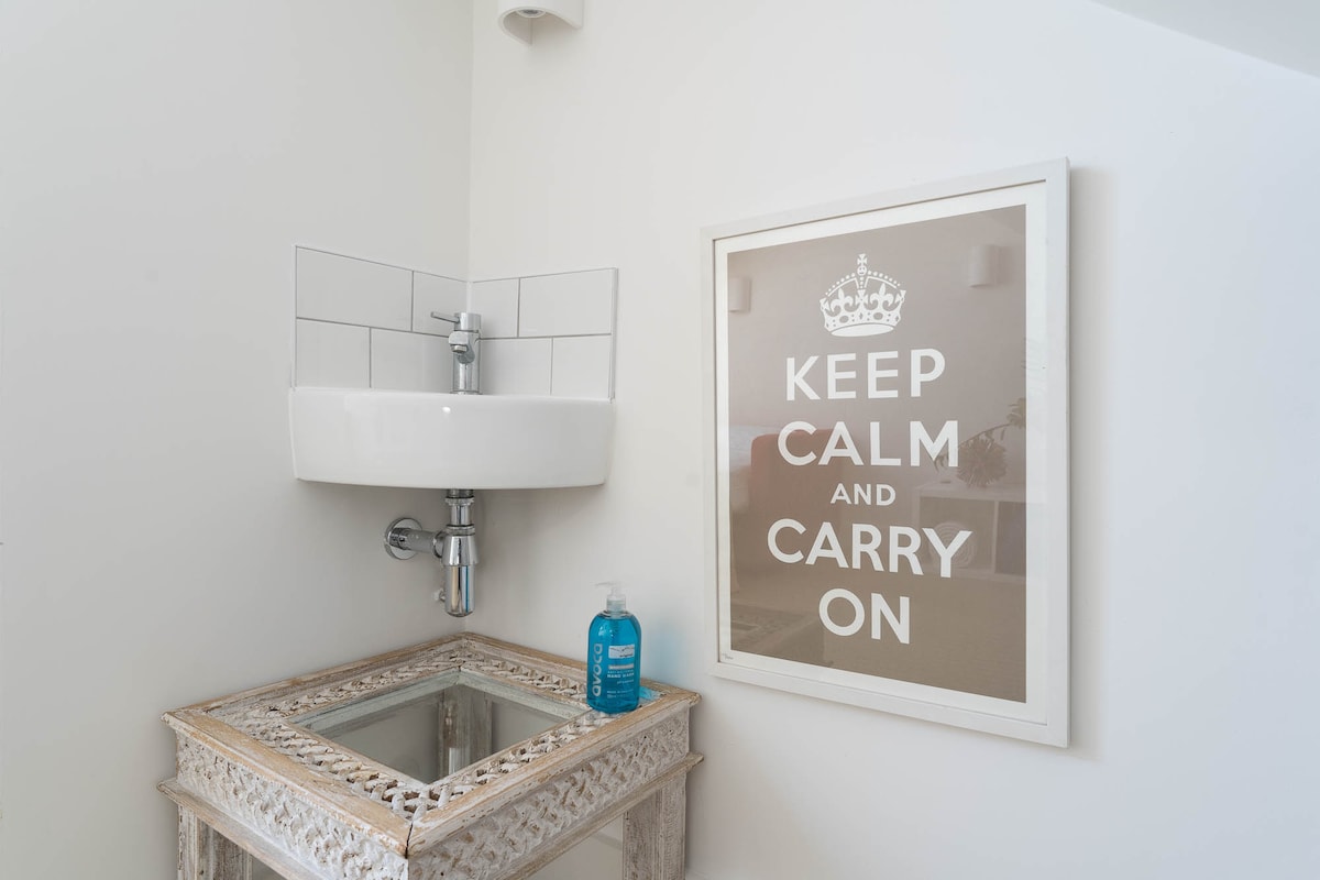 The contemporary white kitchen is fully equipped, featuring a dishwasher, a Dualit toaster, and plenty of cookware, glassware, cutlery, and crockery. There’s also a washing machine and tumble dryer for your convenience. Complimentary tea, coffee, sugar, and cooking essentials are provided. From here, you can access the private garden, which offers a paved terrace area and a touch of greenery—ideal for a morning coffee or an afternoon break.