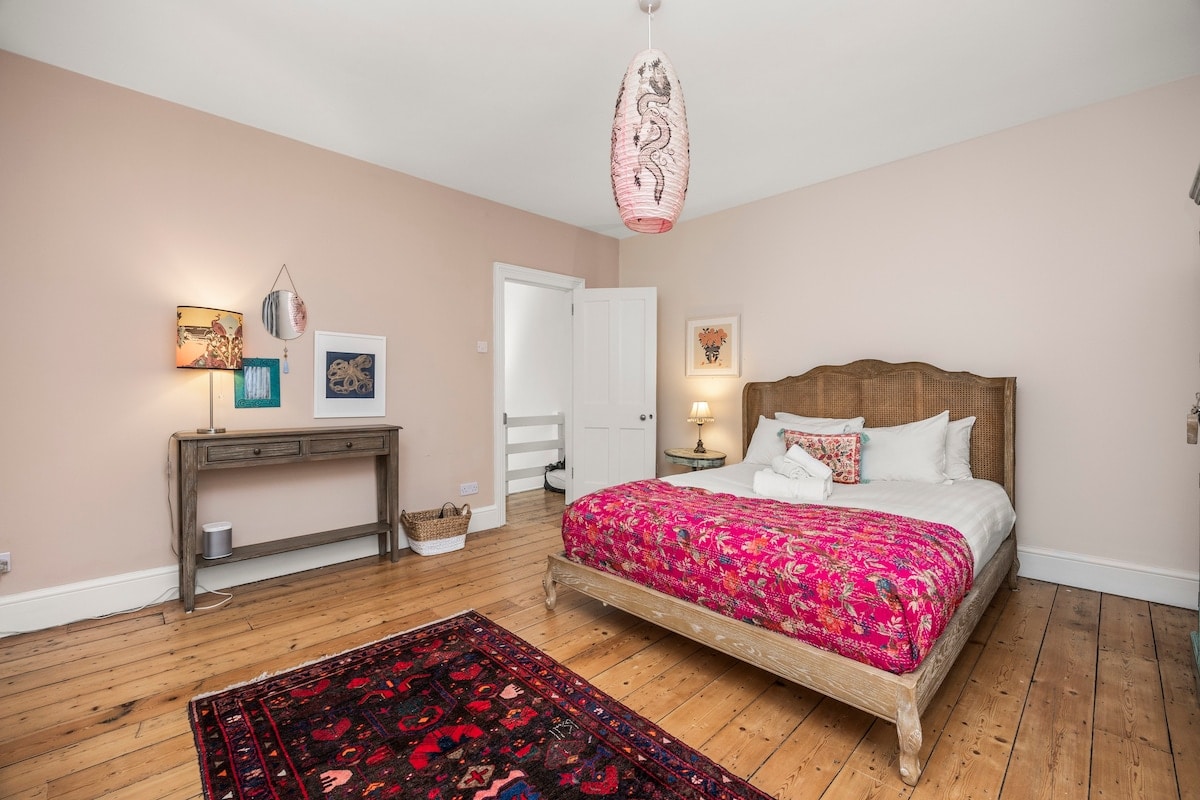 Upstairs, the bedroom boasts a large, elegant king size bed with a wicker headboard and hotel linens. The wooden floorboards add warmth to the space, while the subtle wall colour creates a calming ambiance. A small bedside table with a lamp provides a cozy reading nook, and a rustic wooden desk adds a functional workspace or dressing table. The room is thoughtfully decorated with a mix of modern and traditional elements.