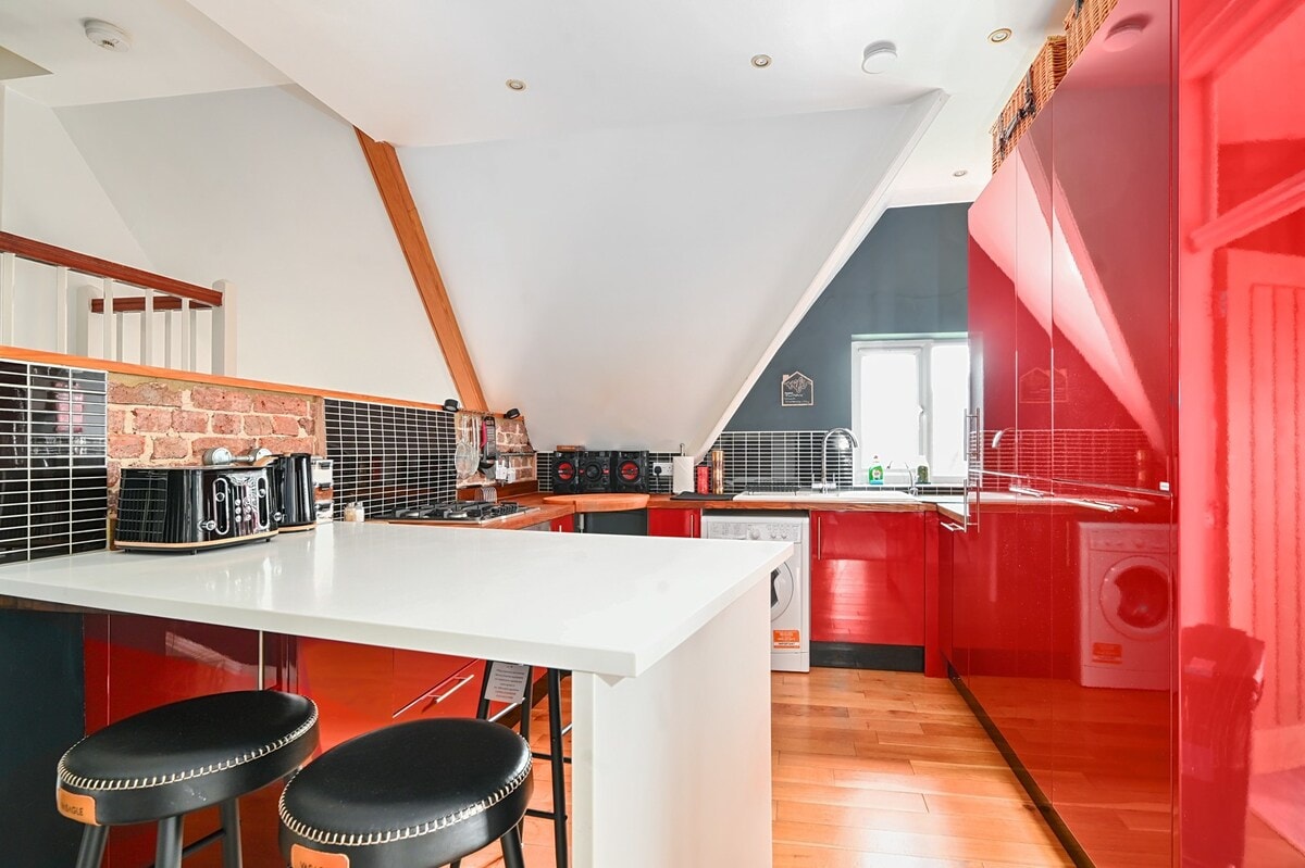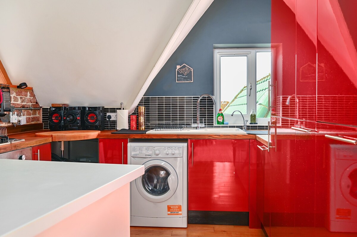 The vibrant red cabinets and ample countertop space make this kitchen a joy to cook in. Equipped with modern appliances and stocked with essentials like tea, coffee, sugar, and cooking basics, the kitchen includes a dishwasher and washing machine for added convenience. Stools under the counter provide a great spot for a morning coffee or casual snack.