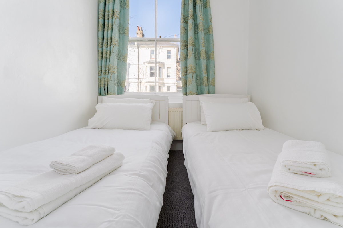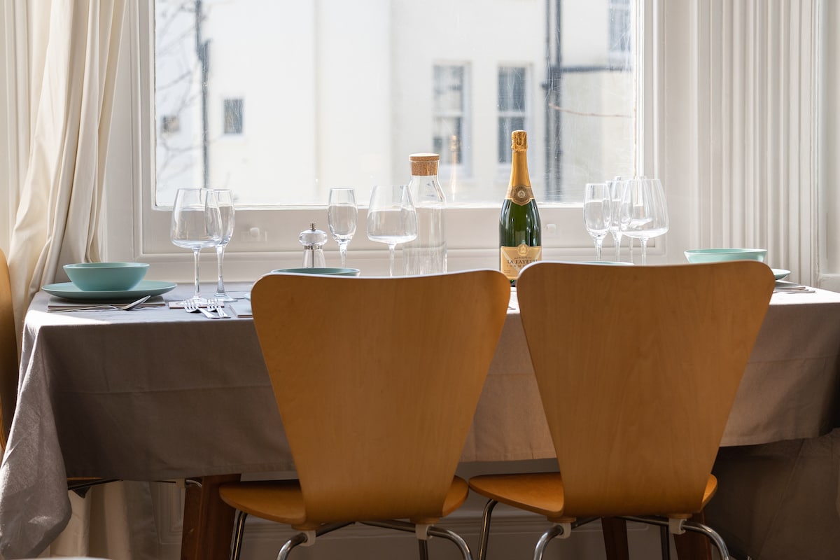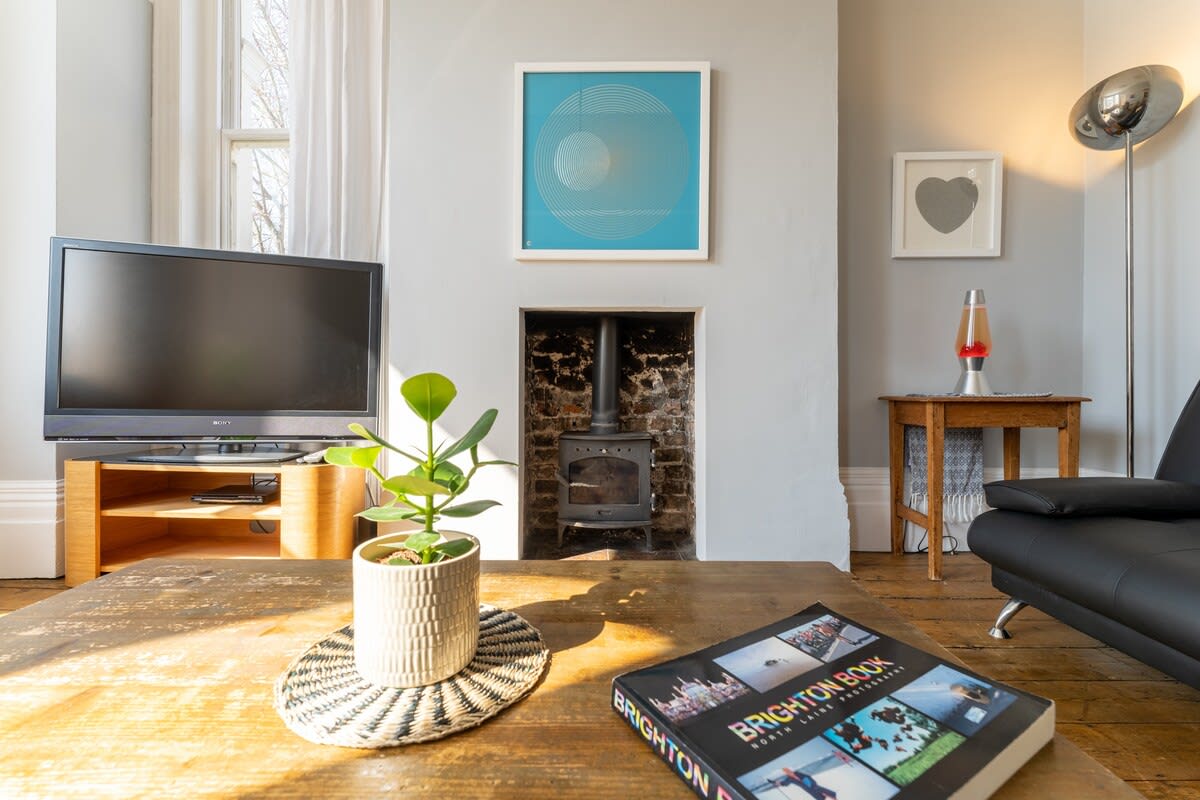 Welcome to this beautifully decorated, split-level apartment in a stunning Victorian house, offering both modern comforts and classic charm. Located on the upper ground floor, this spacious two-bedroom, two-bathroom apartment is perfect for up to six guests. Just a five-minute walk from Brighton train station, and close to Seven Dials, the beach, and vibrant local cafes, this quiet yet central setting makes it ideal for families, friends, and professionals alike.Inside, the apartment features a generous entrance hall leading to the living area and kitchen on the upper level. The living room is designed for relaxation, with comfortable sofas that can double as sofa beds, a TV, a dining table seating up to six, and a cosy log burner to warm you on cooler evenings. The fully equipped kitchen includes everything you need to prepare a meal, from cookware and crockery to a dishwasher and washing machine, plus a small table for morning coffee or workspace.