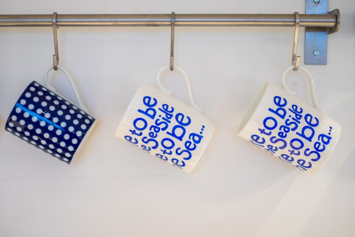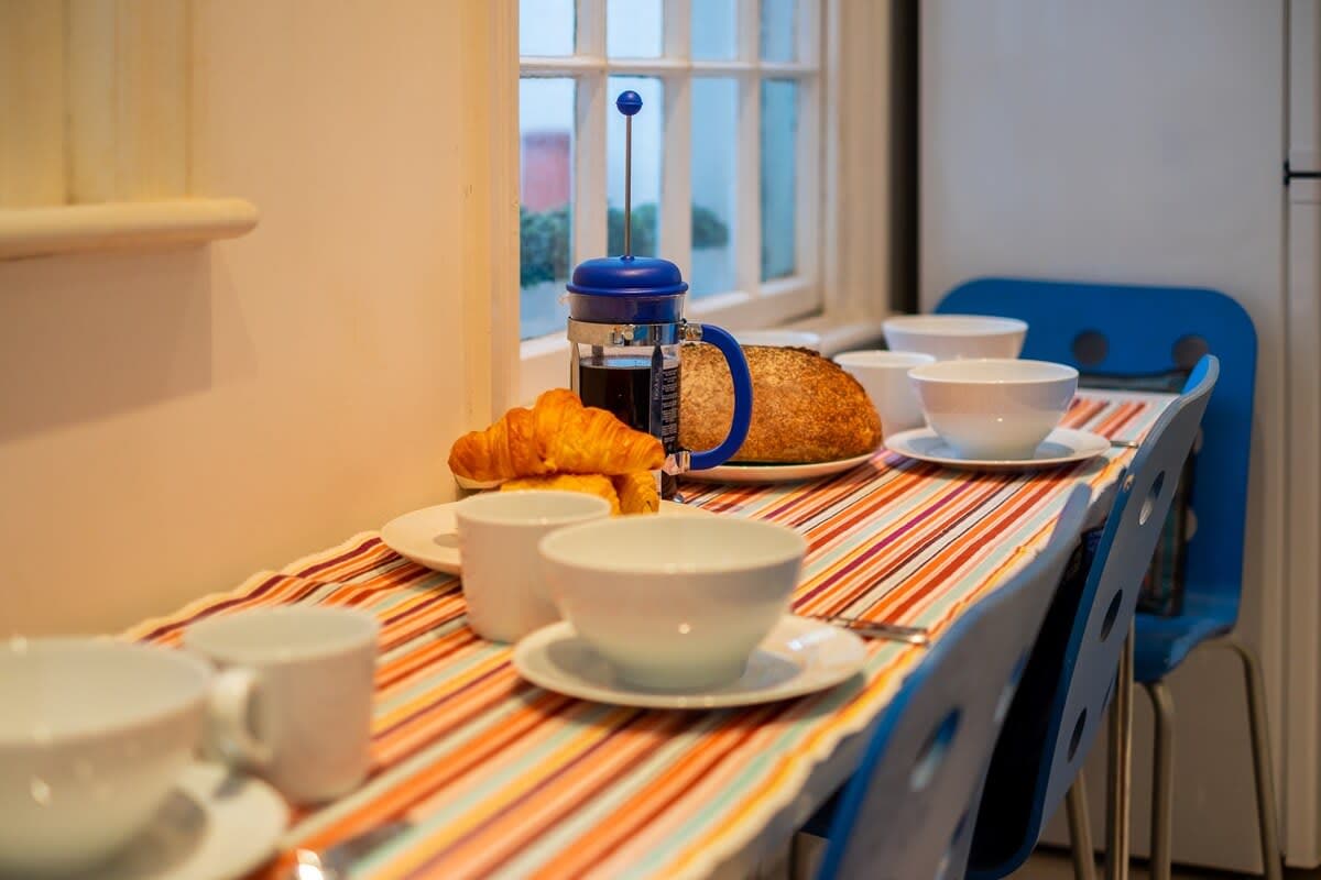 The kitchen is fully equipped with a dishwasher plus plenty of crockery, cutlery, cookware and glassware and a narrow table that's perfect for breakfast or brunch for 4.
