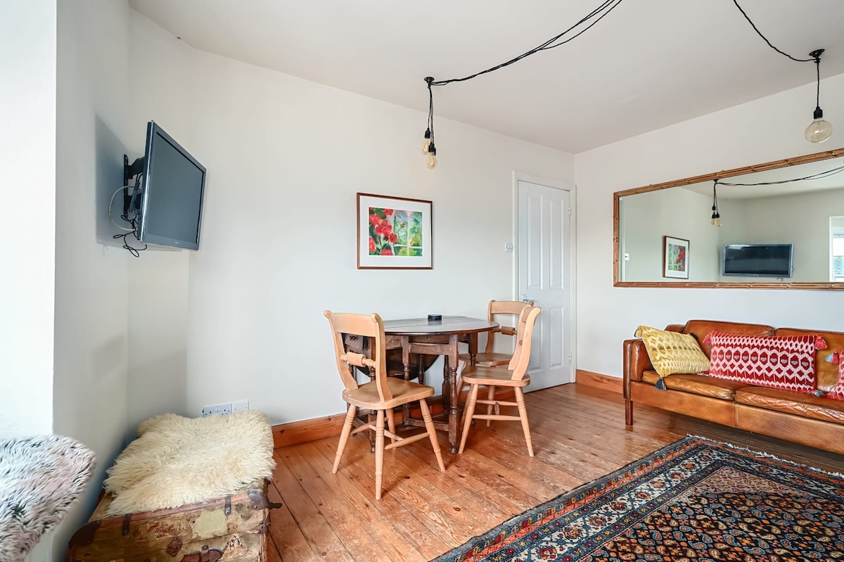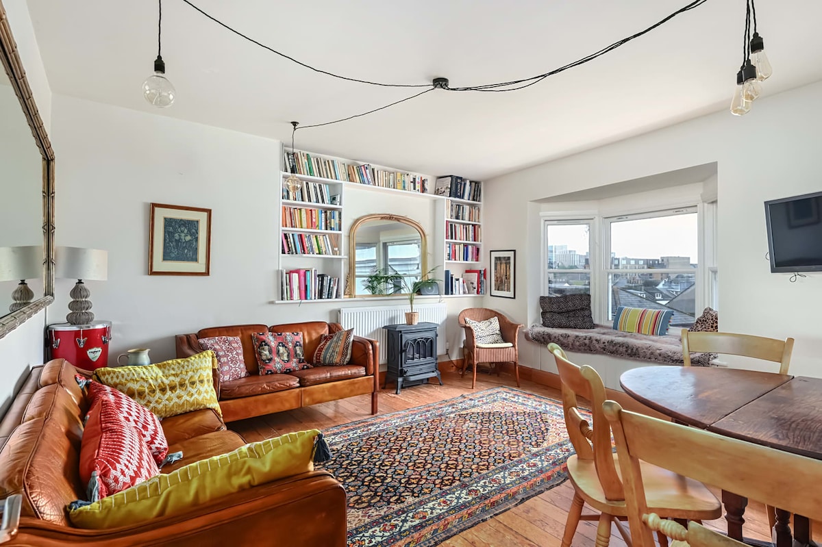The bright living room has plenty of seats to choose from. Relax in front of the Smart TV on the lovely leather sofas, sit on the small chest/ armchair or get comfy by the window with a book or a cuppa and enjoy the view of Brighton’s famous North Laine area, with great independent cafes and shops. There is also a dining area with table and chairs.