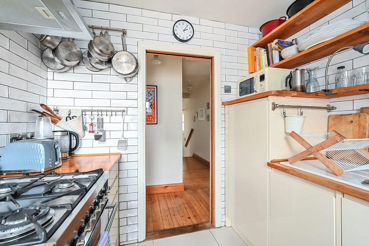 The fully fitted and equipped modern kitchen has everything you need to cook a delicious breakfast, lunch or dinner: oven, microwave, cookware, crockery, cutlery, glassware and a dishwasher so you have more time to enjoy your stay. We also provide all the essential amenities for your stay, including tea, coffee, sugar and cooking basics.