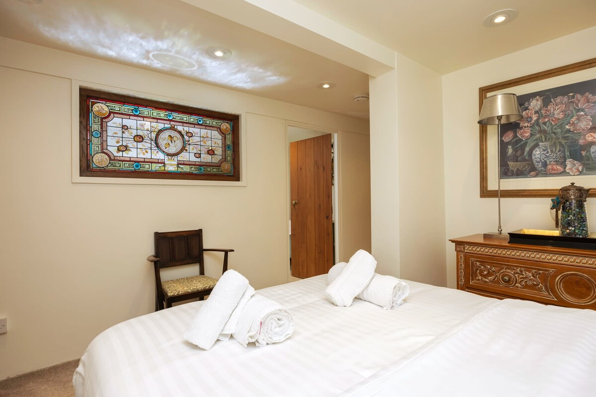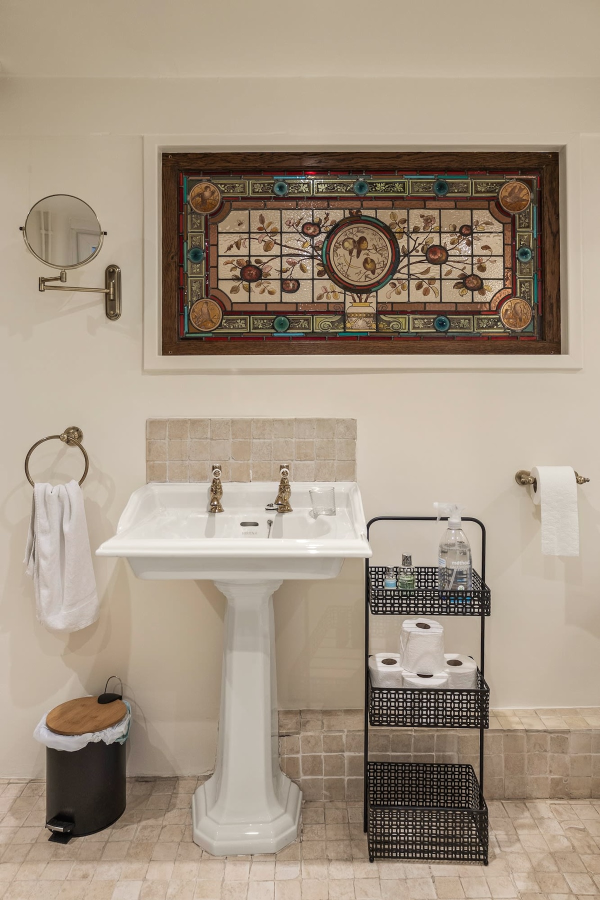 This bedroom suite is located on the lower floor, with its own private ensuite bathroom, it exudes style and character has a touch of glamorous eccentricity with its stained glass window, roll top bath and separate shower.