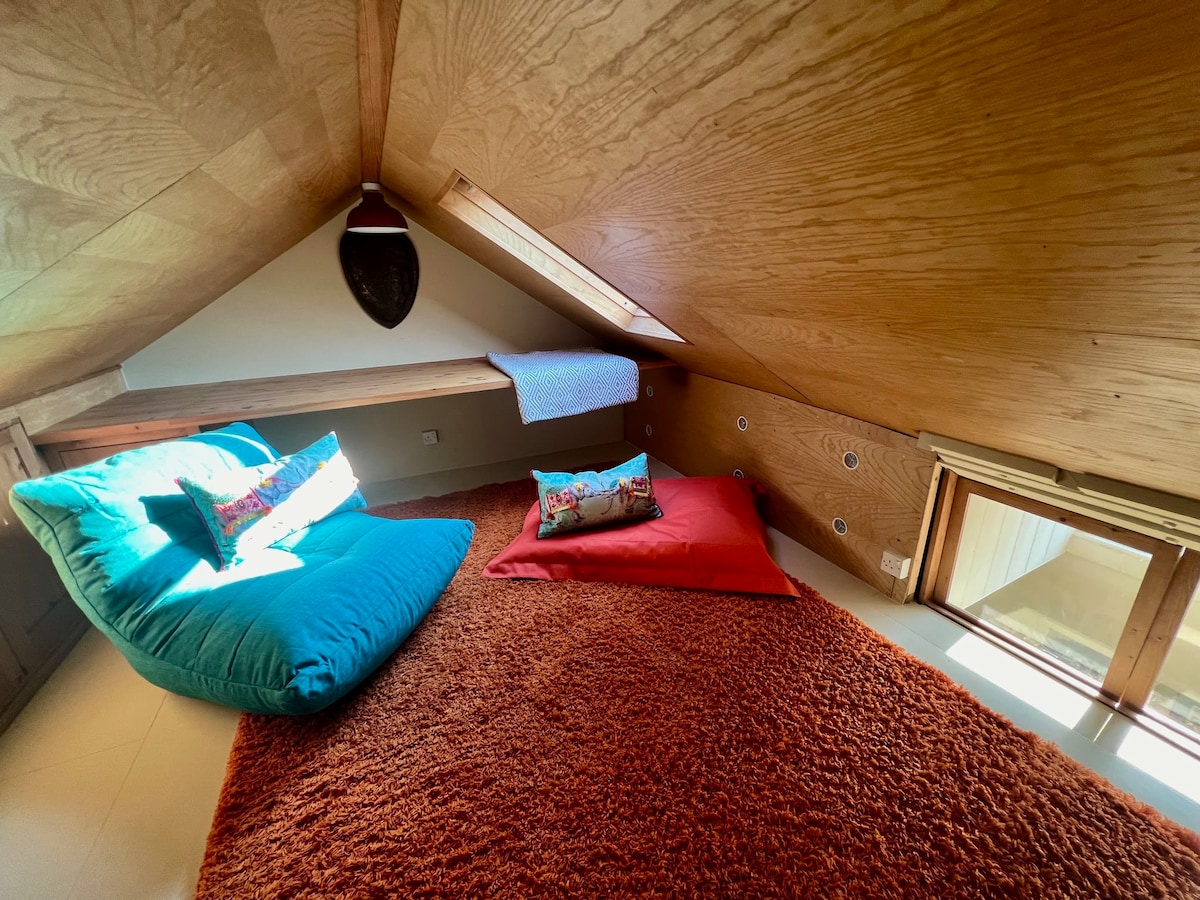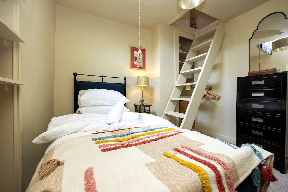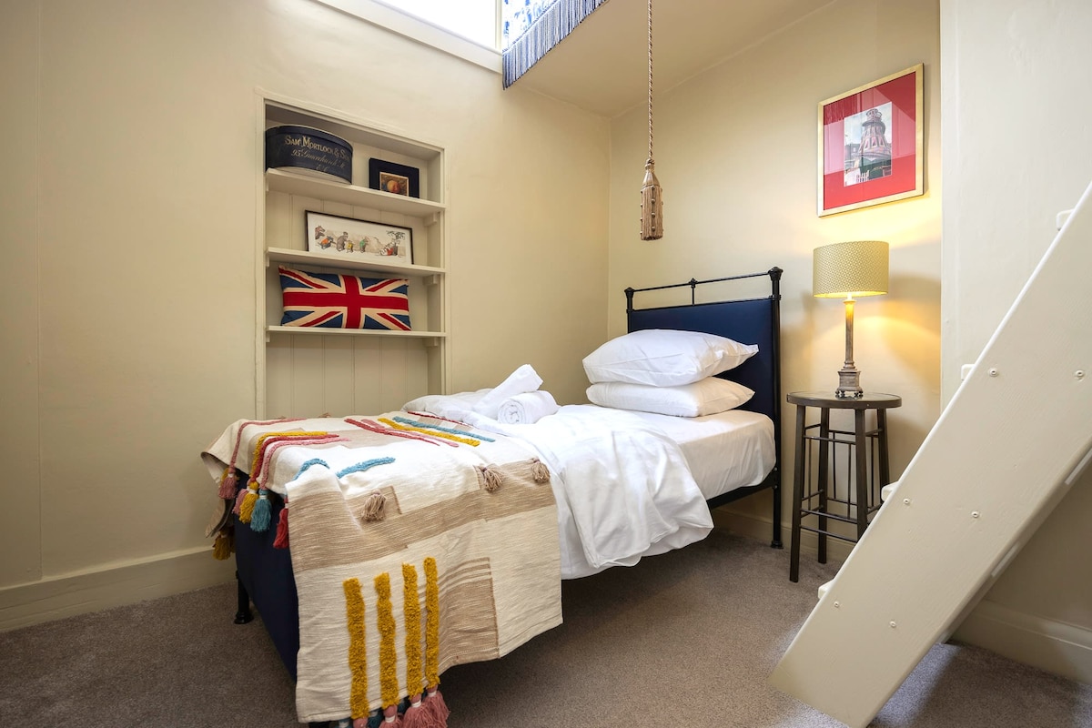 A beautiful, peaceful single bedroom with stairs leading to the large studio space above - the perfect hideaway den for children!