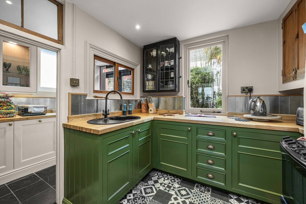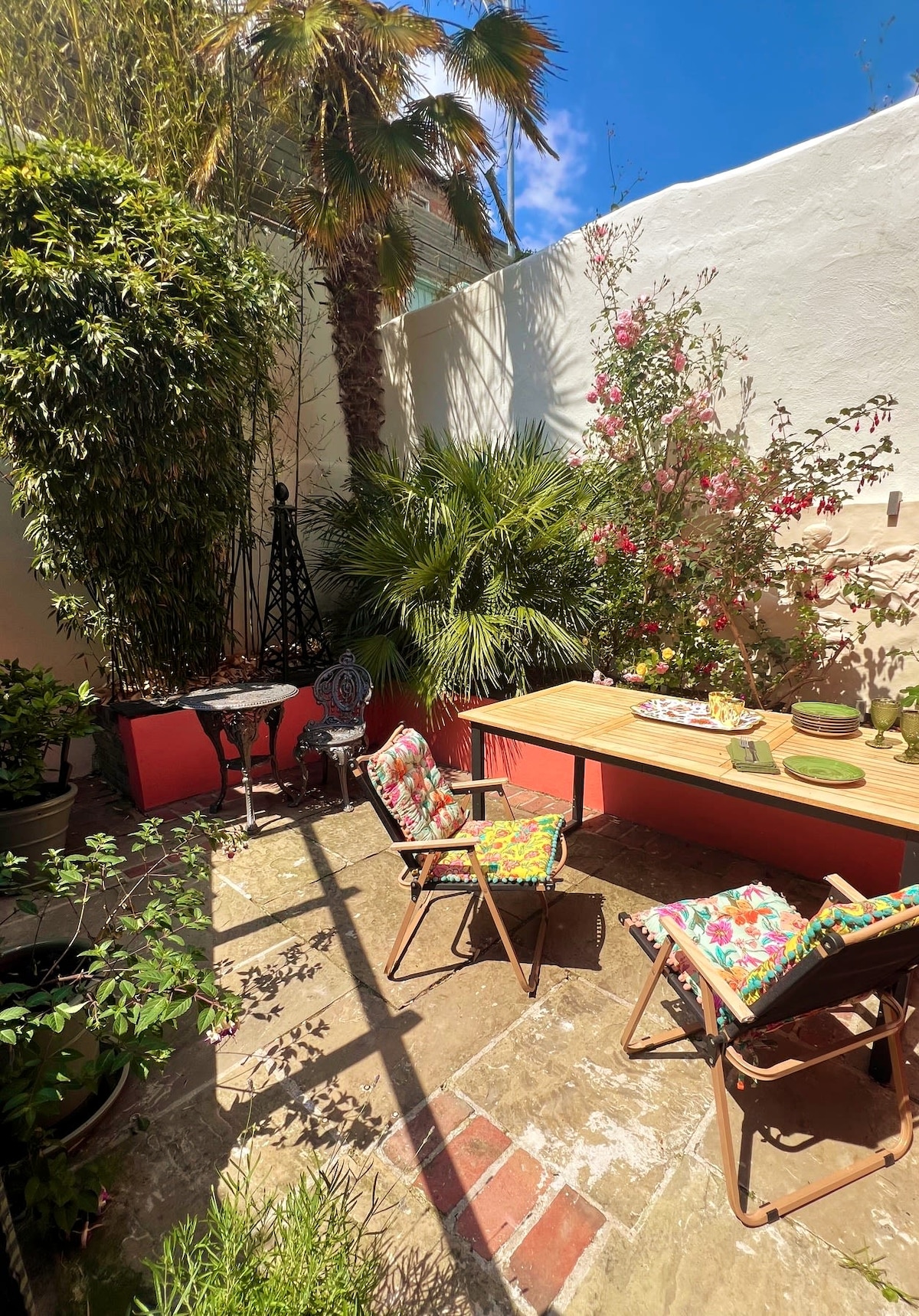 From the extended kitchen, step outside into a private courtyard garden with seating and garden table to seat six so you can dine alfresco in the summer months among the attractively planted out raised beds including a stand of bamboo and a magnificent palm tree. There is a private security gate to the lane beyond.