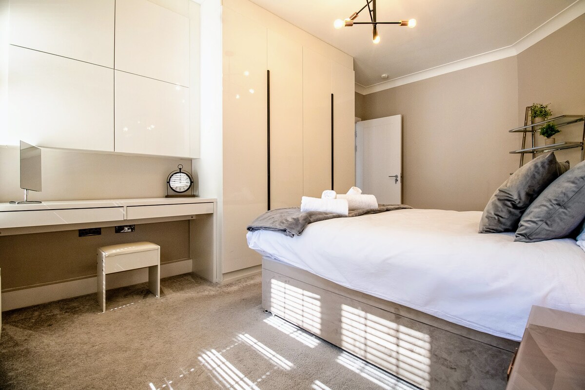 This inviting property features a well-designed layout perfect for a comfortable stay. The living area boasts a spacious 4-seater sofa, ideal for relaxing.The accommodation includes three double bedrooms: Bedroom 1 and Bedroom 2 each come with a double bed, wardrobe, and a dressing table/desk, while Bedroom 3 offers a king bed and a double wardrobe.