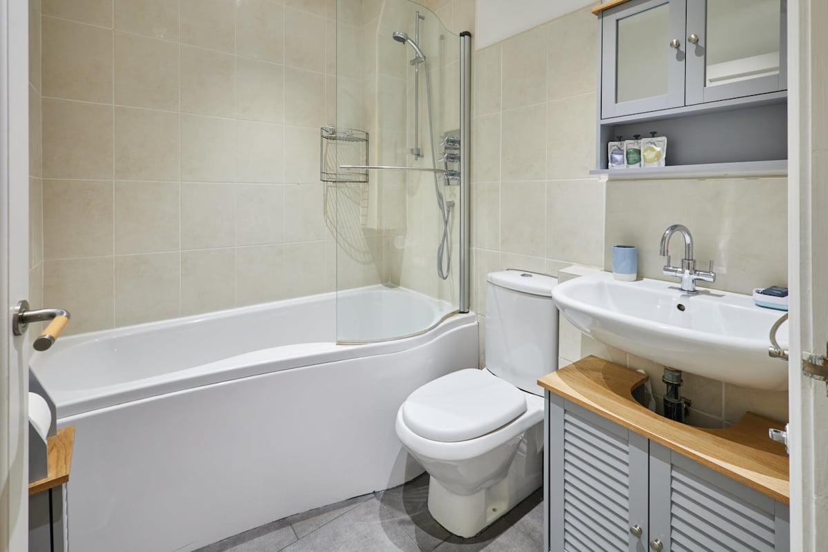 With a neutral colour scheme and quality finishing throughout, River View Cottage has a refined and stylish look. When booking this holiday home, you’ll have full access to the property which includes an open plan living, kitchen and dining area, two bedrooms, a family bathroom, a balcony and a private garden with outdoor furniture.The kitchen perfectly combines modern and traditional with white wooden cabinets and a minimalist design. You’ll have everything you could need to prepare meals easily during your stay as the kitchen is fully equipped with appliances and cookware.