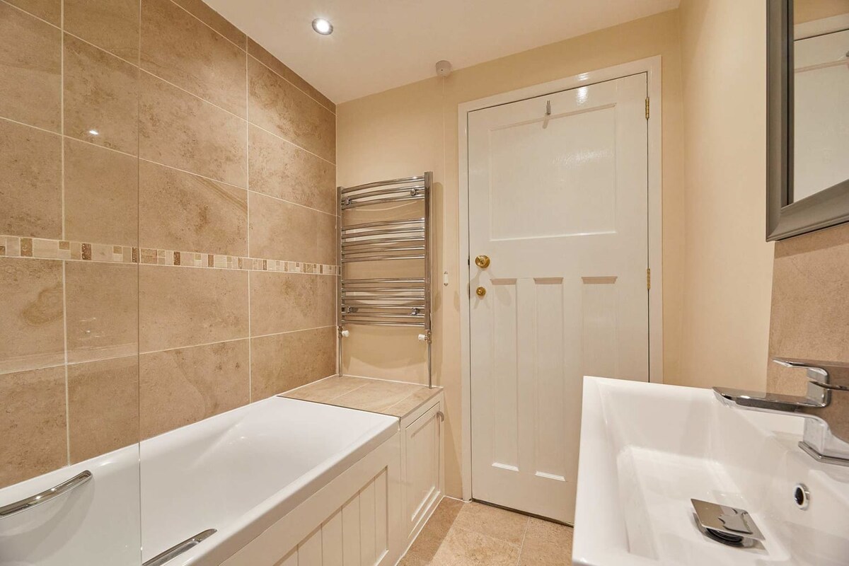 The family bathroom has a spacious bath with overhead shower, WC and basin.