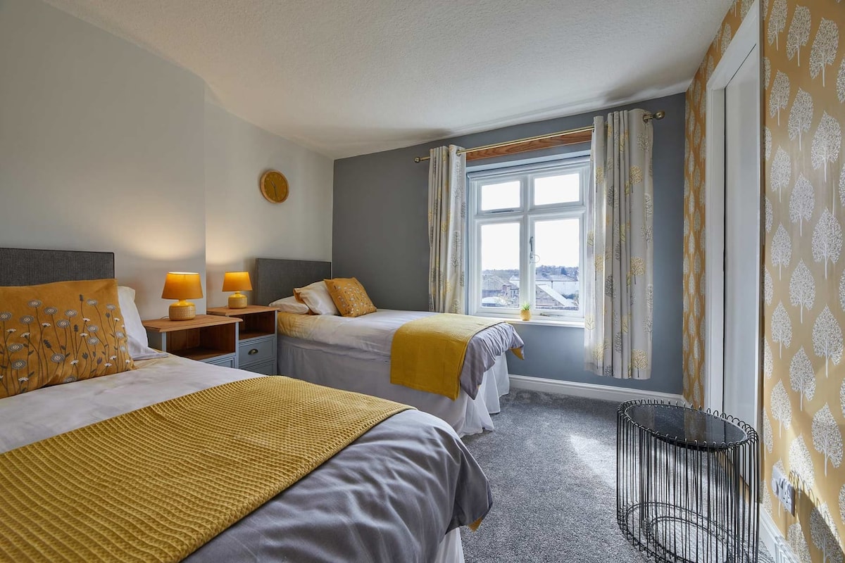 Cummins and Goings Cottage has a stylish living room with a flat screen TV and log burner making it the ideal place to unwind with your loved ones. Herringbone flooring and a statement blue feature wall make this a really cosy place to relax.The house has a spacious kitchen diner. Fully equipped for self-catering stays, the kitchen has modern appliances and cookware. The dining area includes a dining table with four chairs. Outside there is a small yard area with outdoor furniture so you can enjoy your meals alfresco style too.