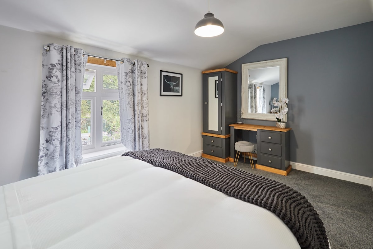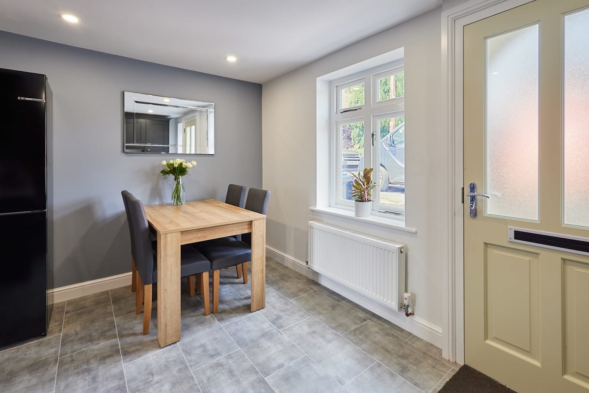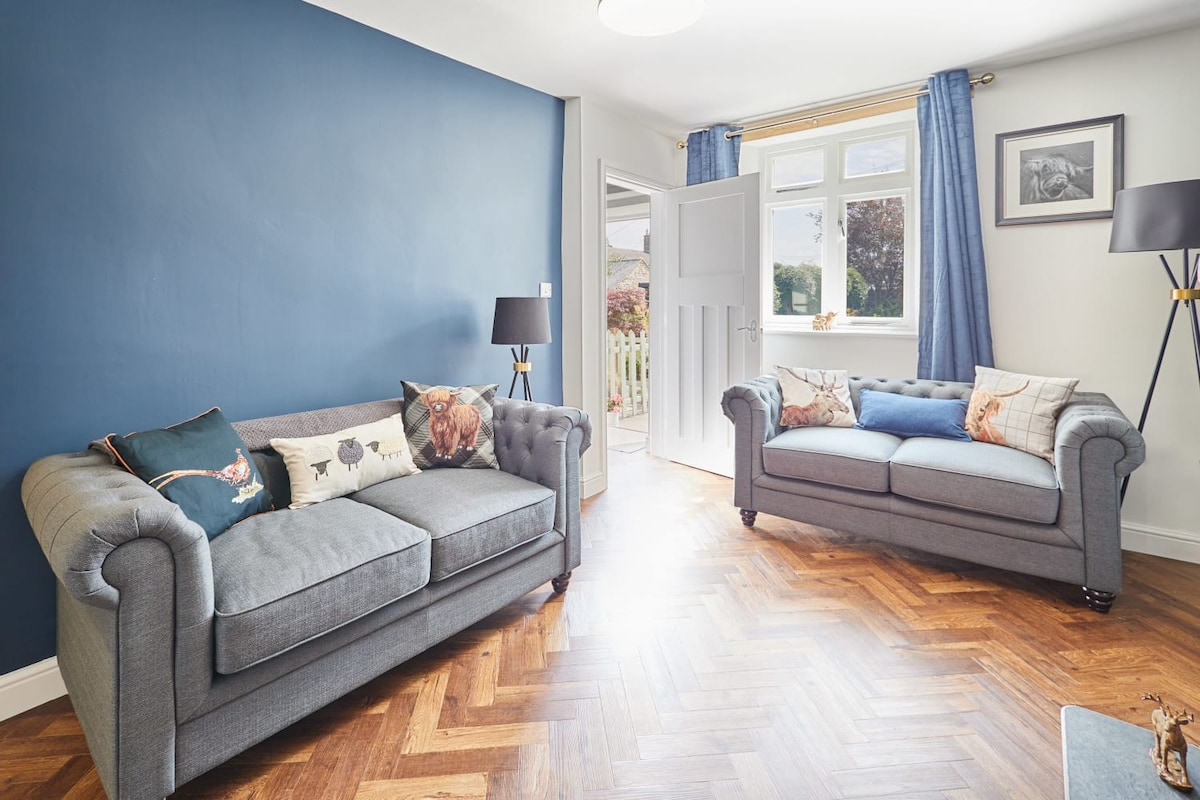Castle View Cottage has a stylish living room with a flat screen TV and log burner making it the ideal place to unwind with your loved ones. Herringbone flooring and a statement blue feature wall make this a really cosy place to relax.The house has a spacious kitchen diner. Fully equipped for self-catering stays, the kitchen has modern appliances and cookware. The dining area includes a dining table with four chairs.