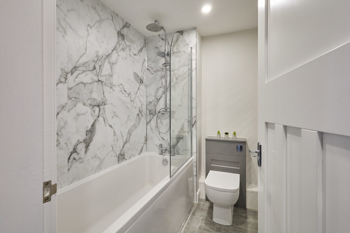 The family bathroom has a spacious bath with overhead shower, WC and basin.