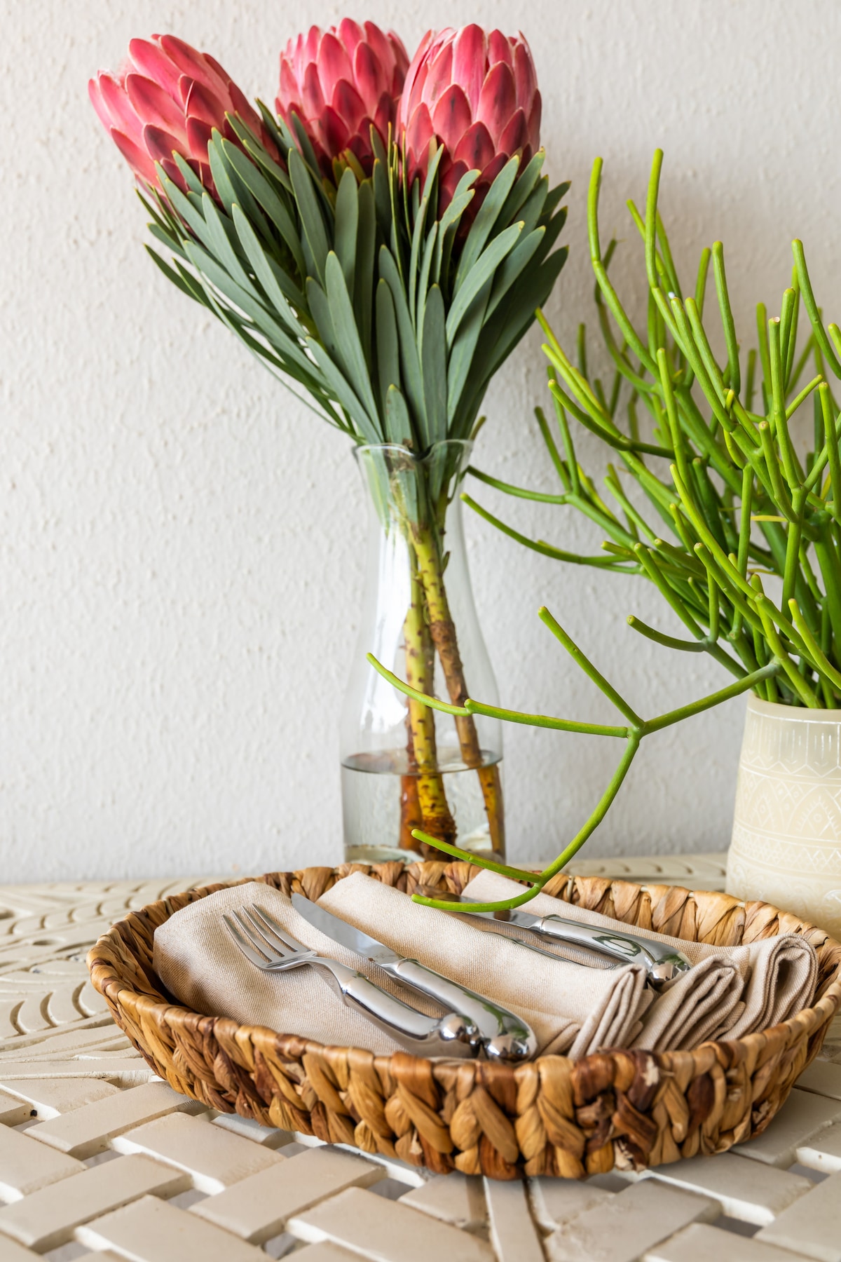 One flight of stairs gives elevated views both over the pool and to the sea.