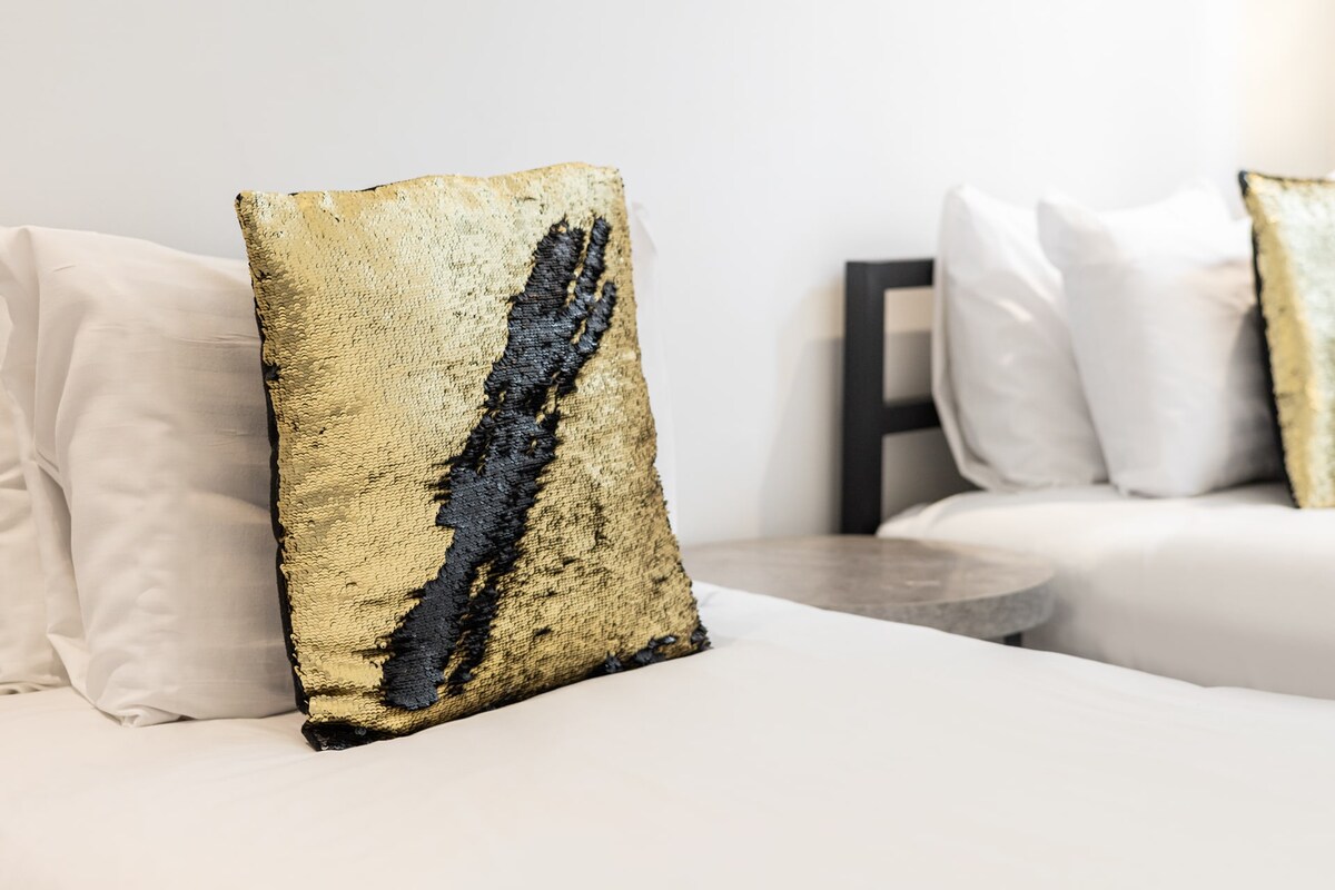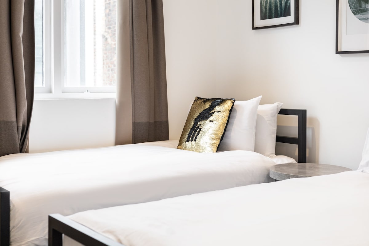 Please note that the beds have recently been changed from doubles to singles. The photos of the beds are general photos across all our listings in the building; however, the quality and style are the same.