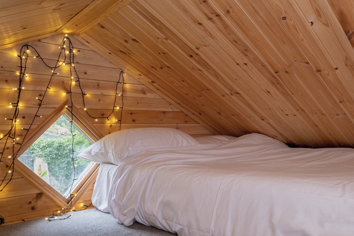 Upon entering, the cabin captivates with exposed wood accents and a snug double bed, kitchen (with stove and microwave oven & grill) and shower-equipped bathroom. Note that the bathroom features an eco-compost toilet. A mezzanine level offers an additional sleeping area with a double bed.
