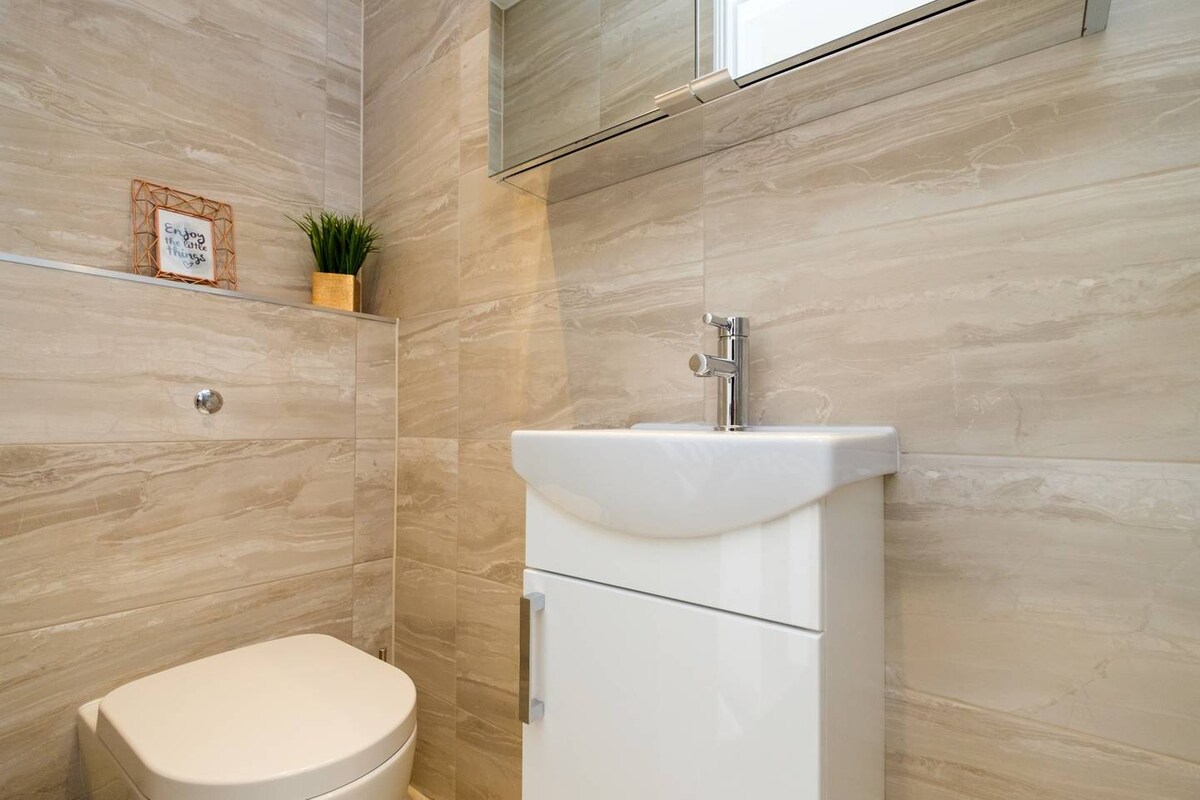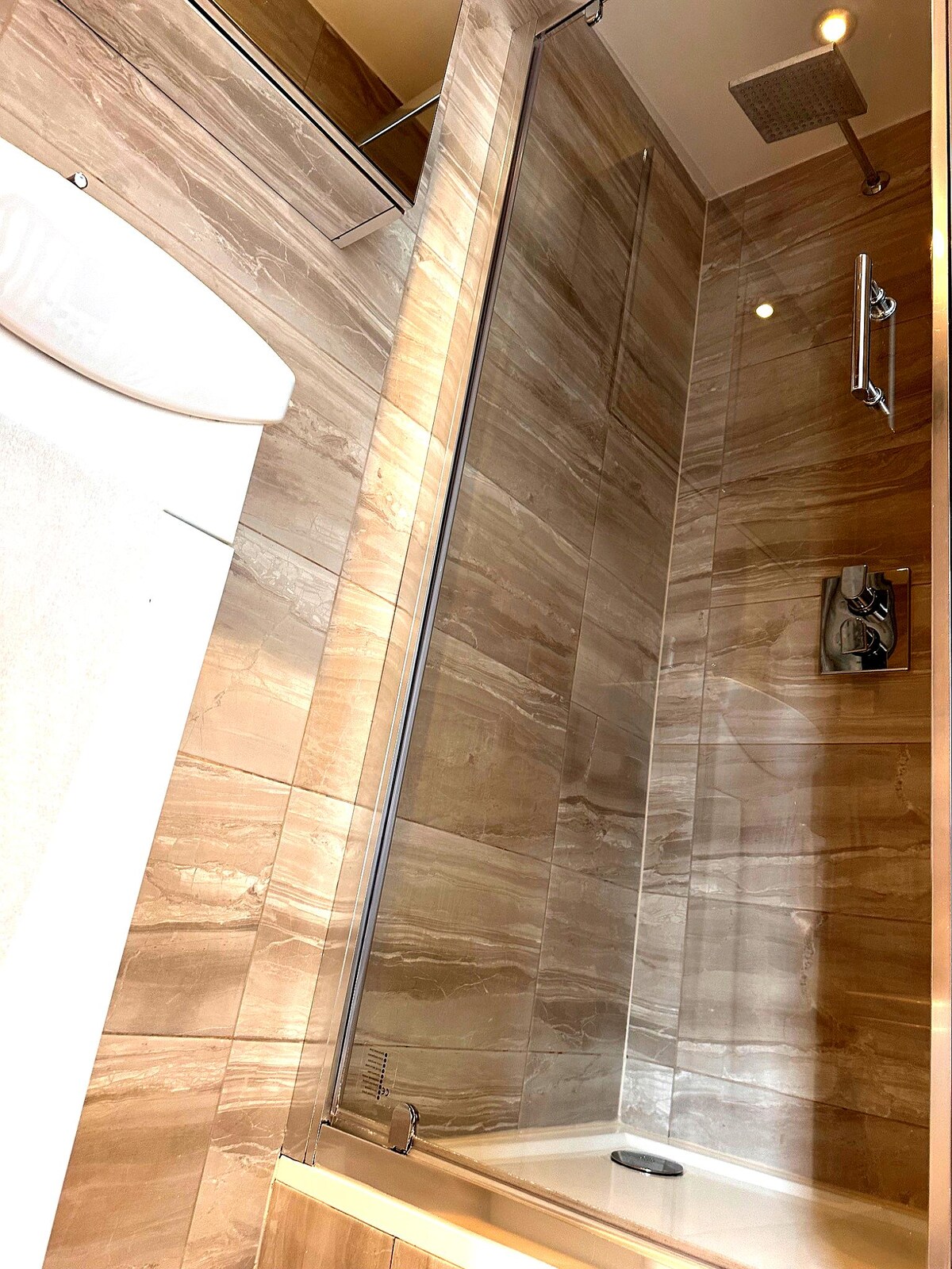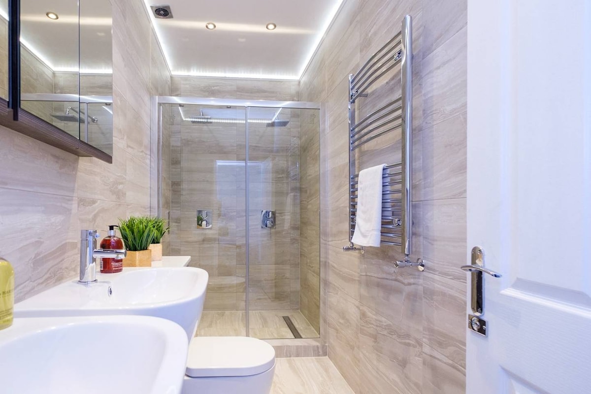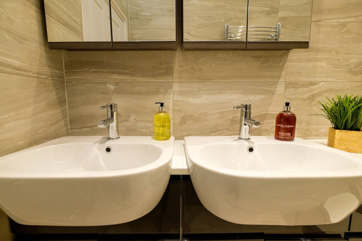 Next is the stunning main bathroom with double sinks and a huge walk in shower with two rain shower heads. This means two can shower at the same time, if you fancy! There is a further bathroom up on the next floor. Both are fully stocked up with toiletries including as soap, shampoo & conditioner.
