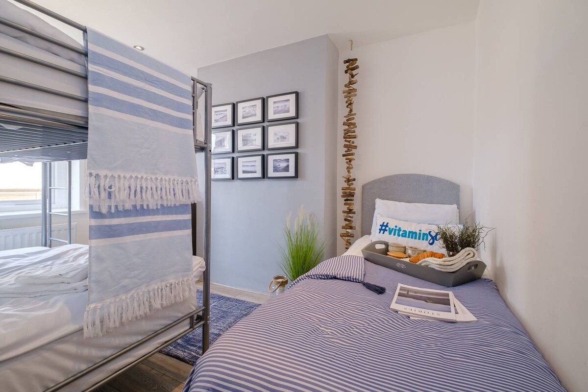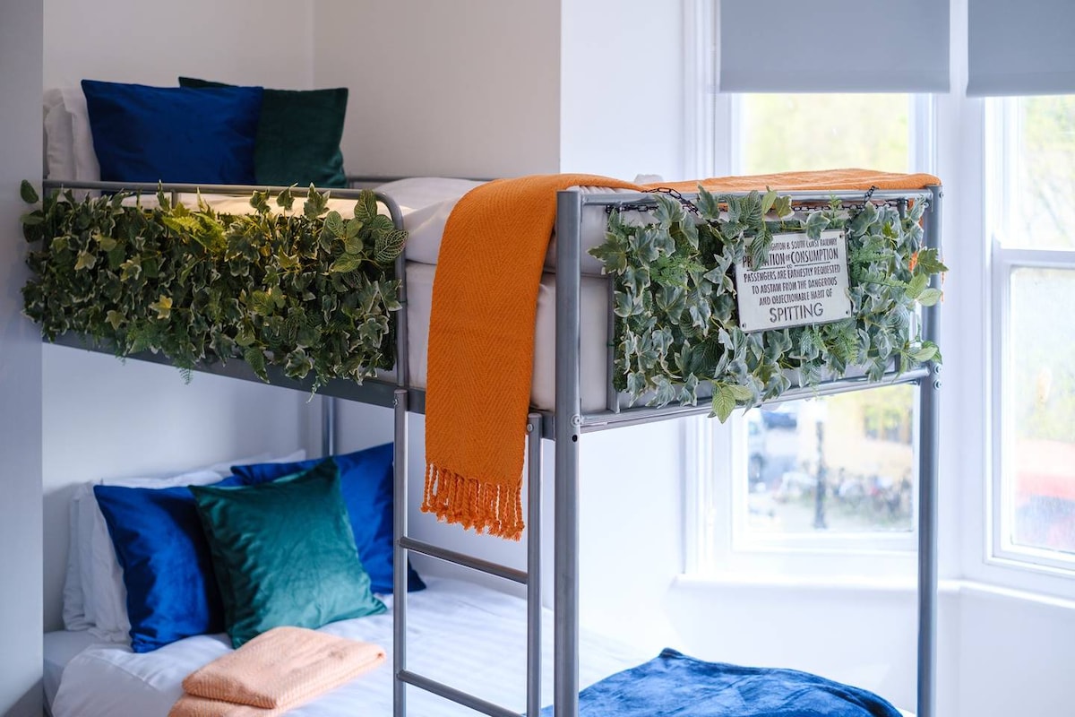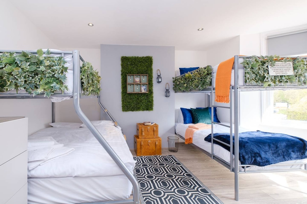 Bedroom 2 has bunk beds and a separate single bed, sleeping 3 in total. With a large sash window, it's a lovely light bright and airy room. We have graffiti style art on the wall and plenty storage space for your personal items.