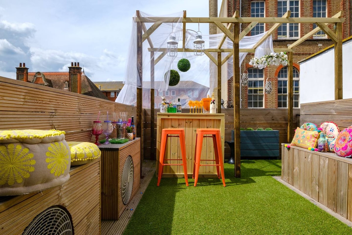 On this floor also there is a stunning fully decked roof terrace with plenty of seating for everyone. This is a wonderful place to sit and have drinks at night or perhaps a spot of sunbathing in the daytime! There are pretty planters around the edge to add a touch of greenery. This has fun written all over it....the ultimate social space.