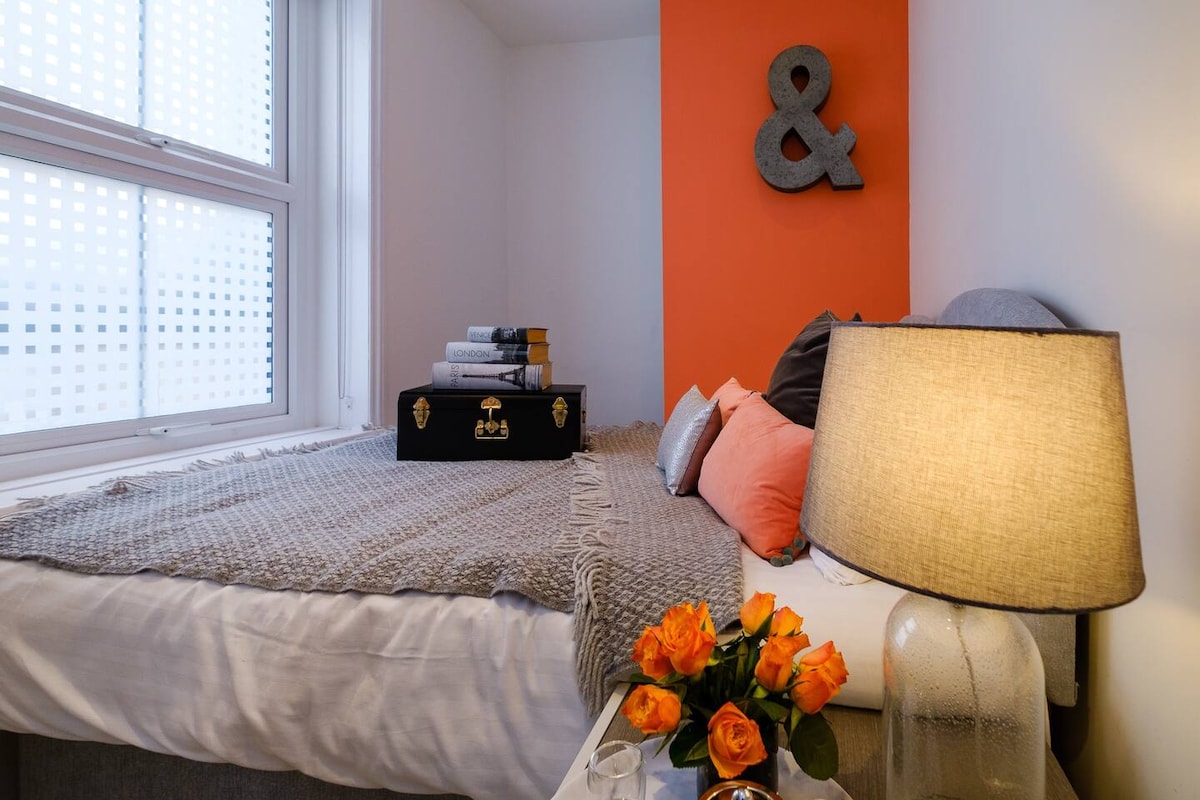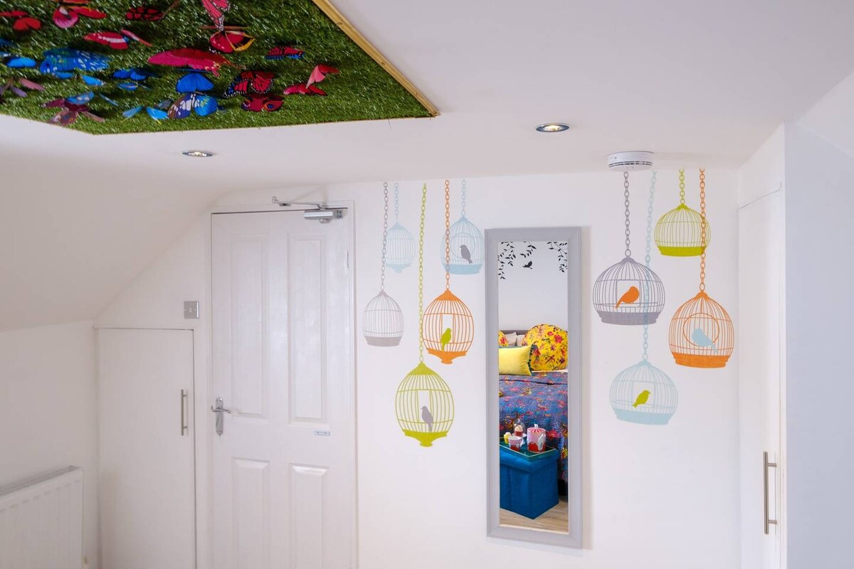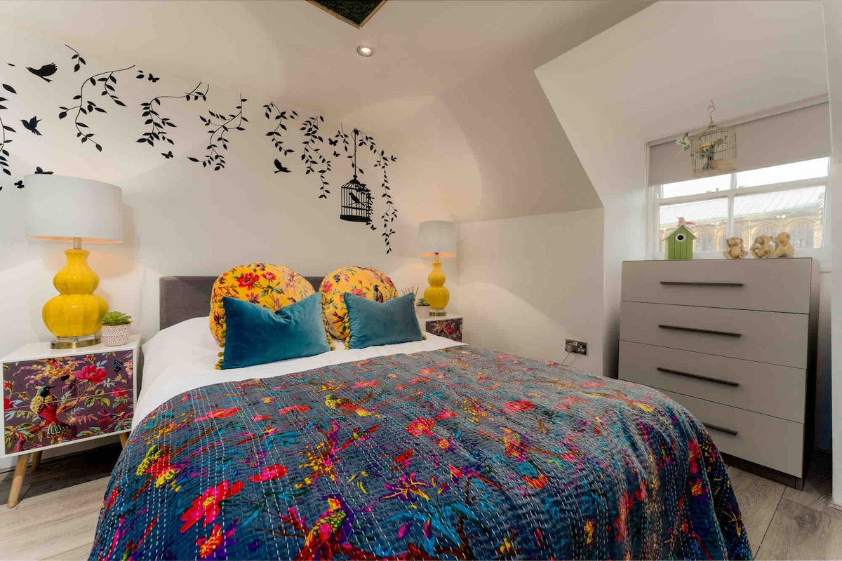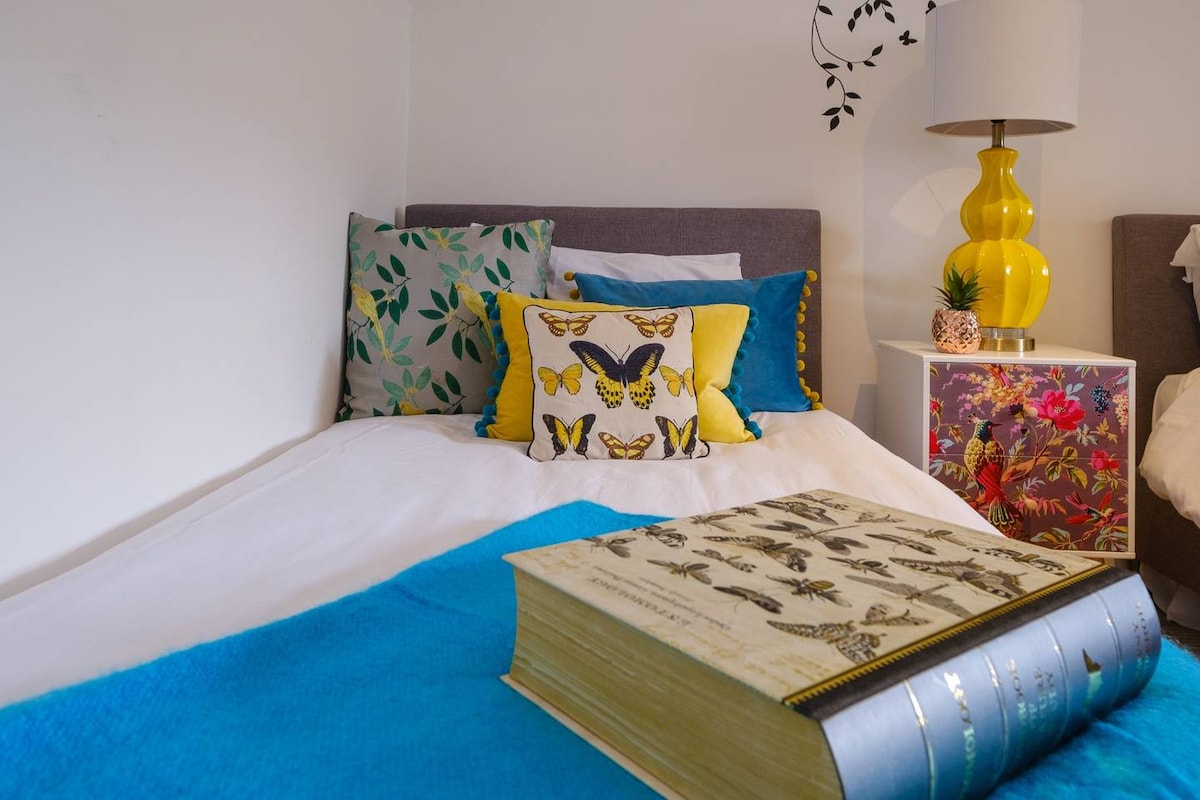 Up to the third floor you will find Bedroom 4. This is tastefully decorated with pretty lighting, bedside tables and unusual artwork, a butterfly ceiling and and plenty of storage. This room has a single bed next to a double bed. The sash window looks out to the front of the apartment with views of St Peter's Church.