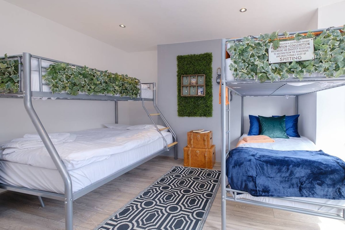 This is perfectly located for a group who want access to the Laines and the seafront. The house has 4 bedrooms with a mix of bunk beds (3 sets in the largest room) and double rooms etc. The living area was big enough for us to gather together and the outdoor terrace allowed a bit of fresh air and sun. Particularly useful for bigger groups is the keyless entry and the property is secure behind three coded doors. There are a couple of supermarkets nearby and we had great meals at Moksha & Dough Lover within a couple of minutes' walk. Everything we did within Brighton was walkable from the property, with the station about 7 minutes' walk away. House would be perfect for a group of friends in Brighton for the weekend, up to about 15 people.