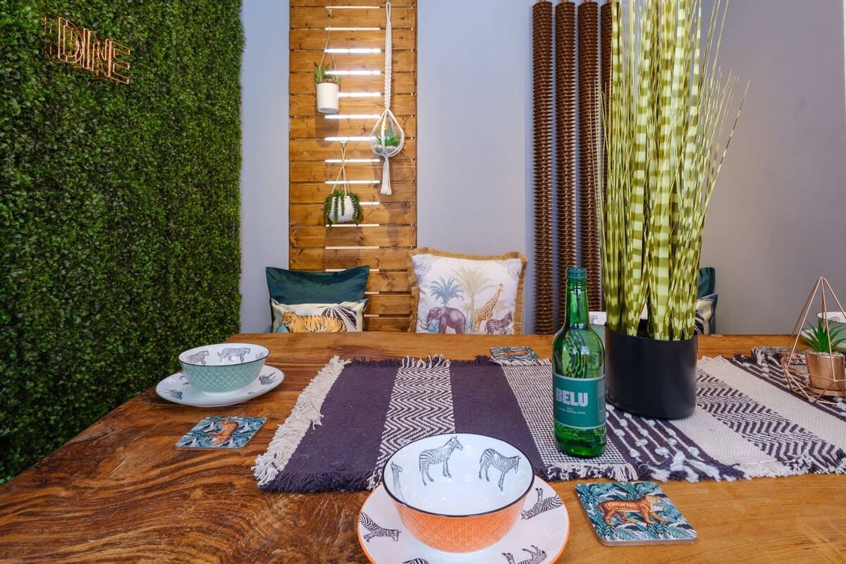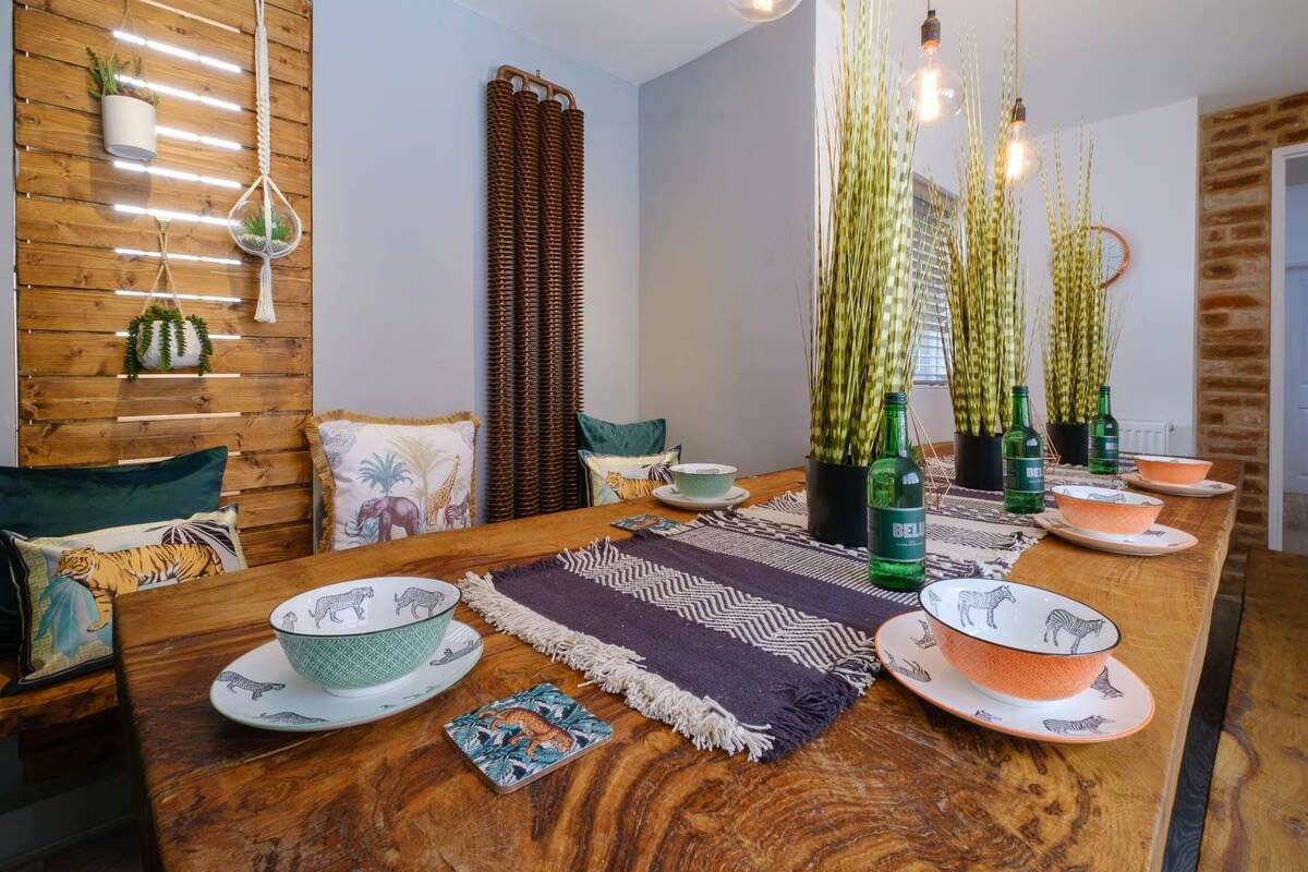 Head through a private gated area, up a few steps to the main entrance straight into the contemporary kitchen/dining area with huge dining table - it's quirky design is jungle themed, with great lighting and unusual fun decorative touches to make this space a really lovely place to be with your family of friends.