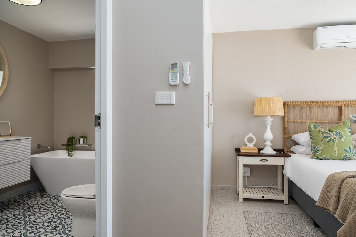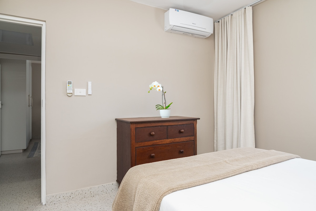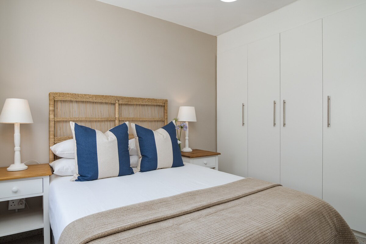 The main bedroom has a Queen size bed with crisp white linen.