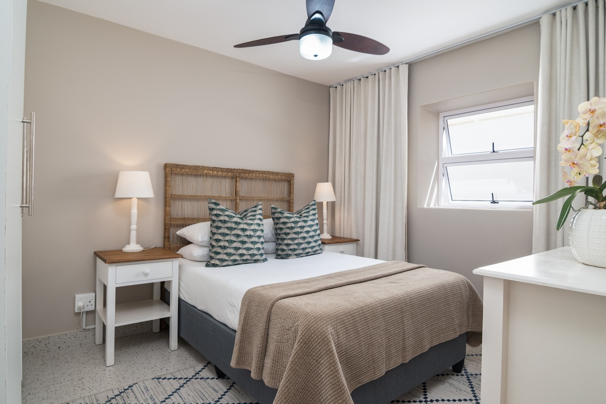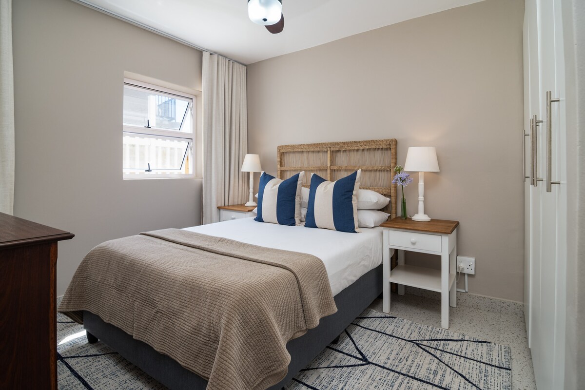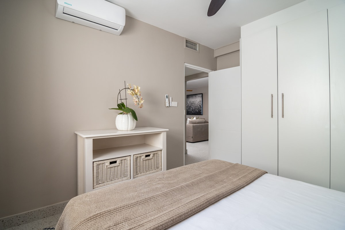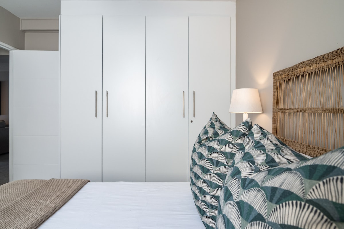 The main bedroom has a Queen size bed with crisp white linen.