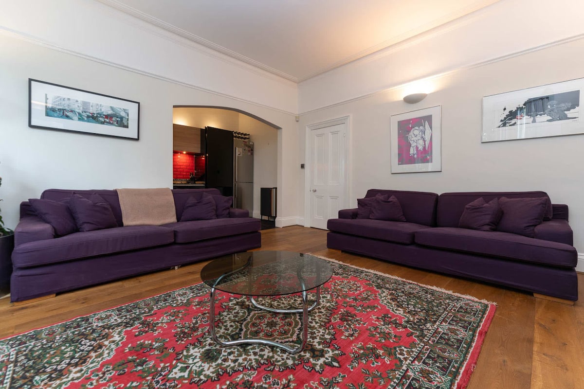 Situated on the first and second floor of this Victorian building is our spacious and well loved one bedroom flat. There's a sizeable, high ceilinged lounge with 3 sofas on the first floor and a newly renovated kitchen we're sad to leave. You're more than welcome to use our bean-to-cup coffee machine, and enjoy coffee and breakfast in the morning on the breakfast bar with 2 stools. There is also plenty of tea, if you prefer!Up the stairs is the large double bedroom. There is wifi throughout the flat (it's decent) and Sonos that you're welcome to use. There is plenty of space to store any personal belongings. The bed is made up with fresh white linen and there are plenty of towels. On the same floor, the bathroom has a lovely bath and more notably a shower that I'm a big fan of. It's kept well stocked with toiletries such as soap and shampoo.