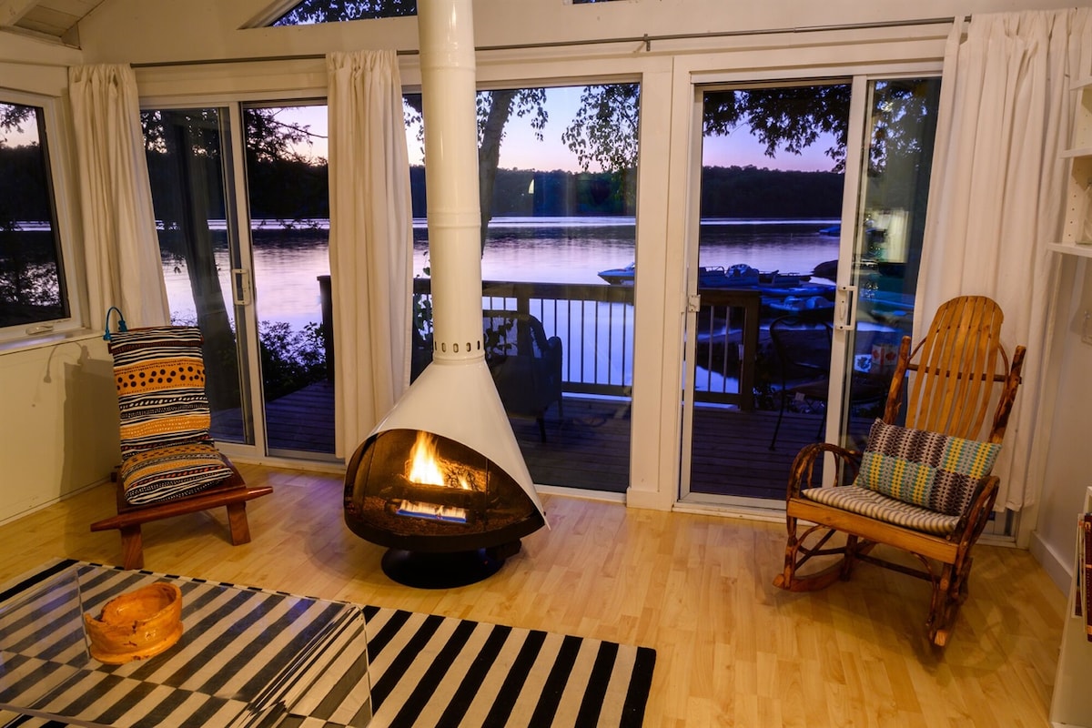 Relax on your deck that sits over the water,, or come inside and warm yourself by our modern fireplace when it gets chilly.What else to do? Pickleball, basketball, a pool table, kayaks, canoes, stand up paddle boards & rent pontoons