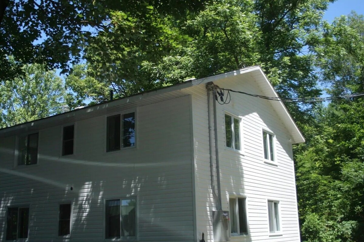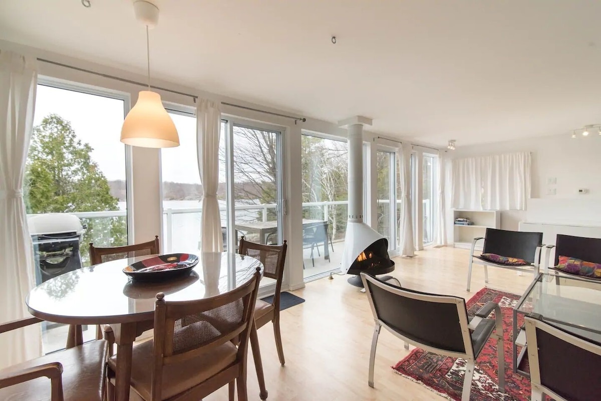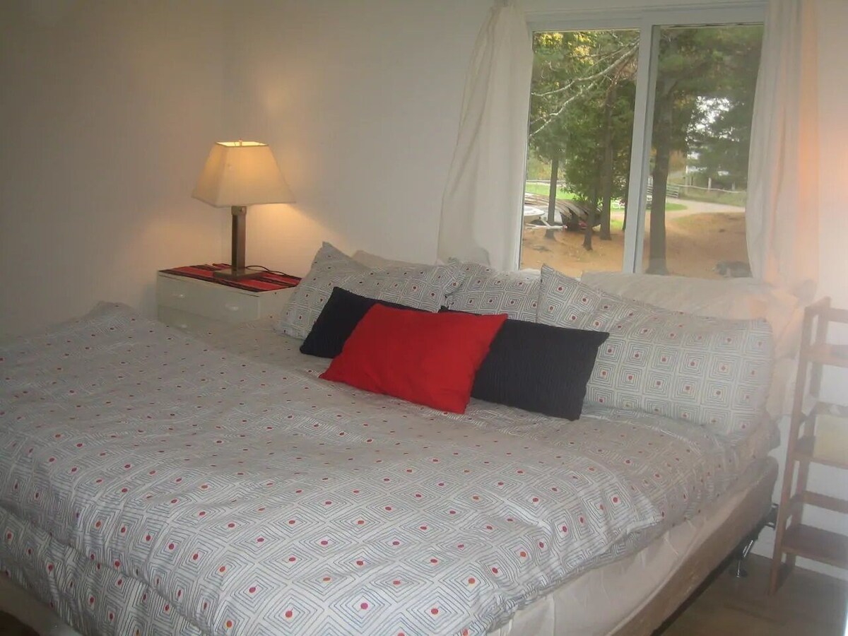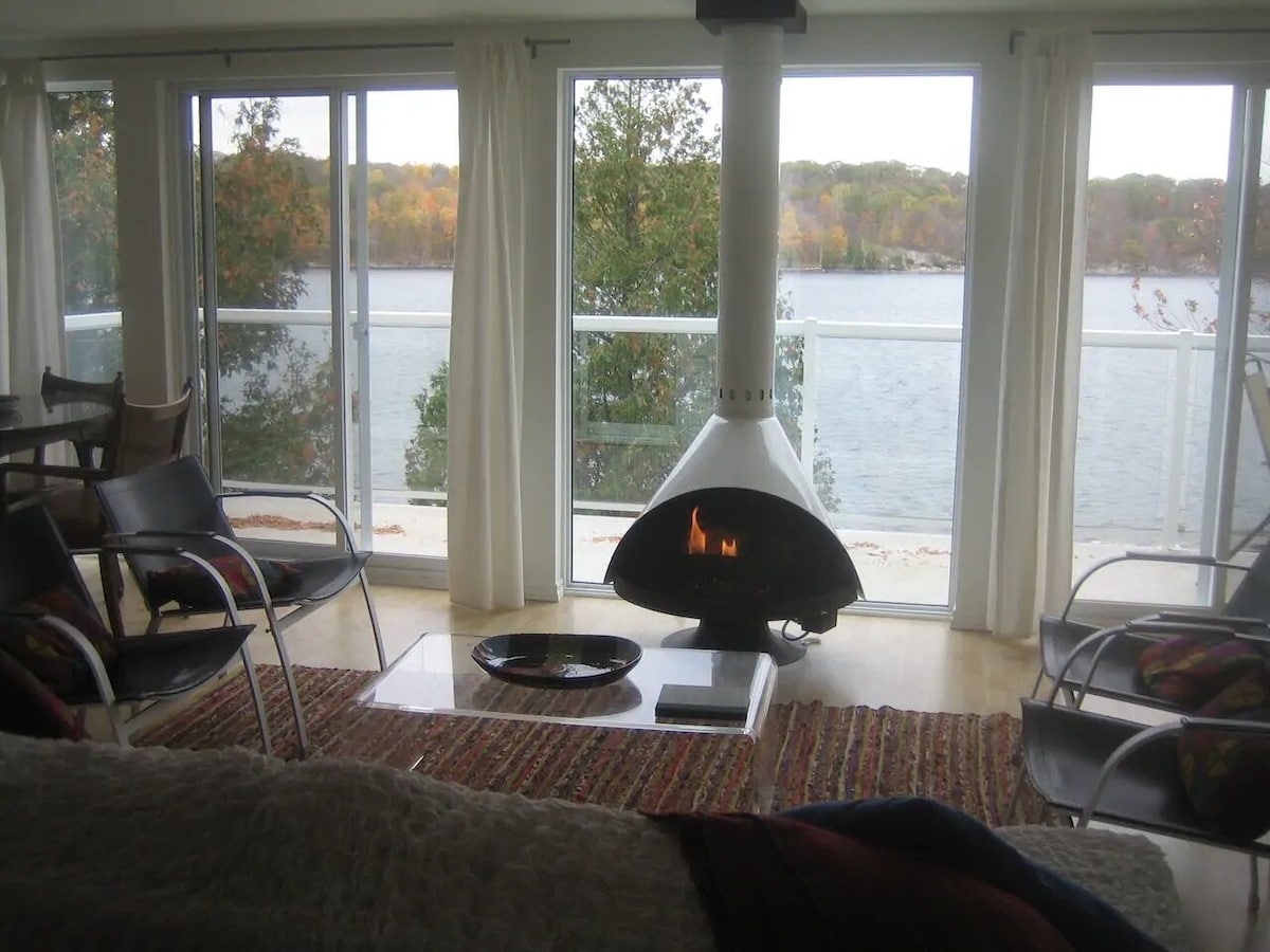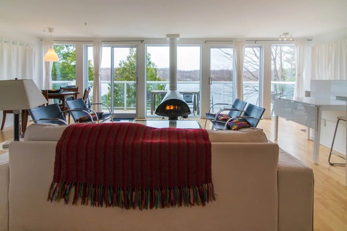 Gorgeous 2 bedroom completely renovated luxury unit, central air/ modern gas fireplace, 25 feet of glass, 25 foot deck feet from the lake, all new furniture, kitchen, floor, king size beds separate into extra long twins--This 2 bedroom has it all-- modern, feet from lake, deck, hot tub, glass front--1 1/2 hours from Ottawa, midway between Toronto and Montreal, 7 hr drive from NY city.
