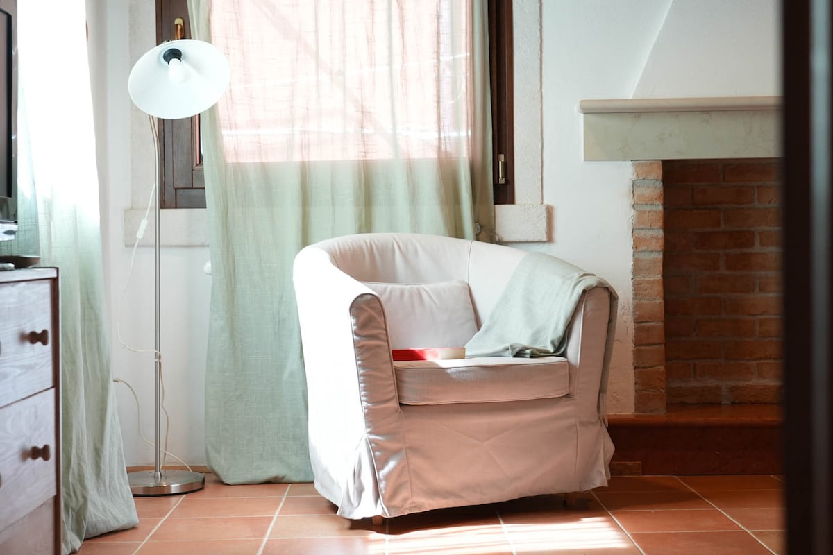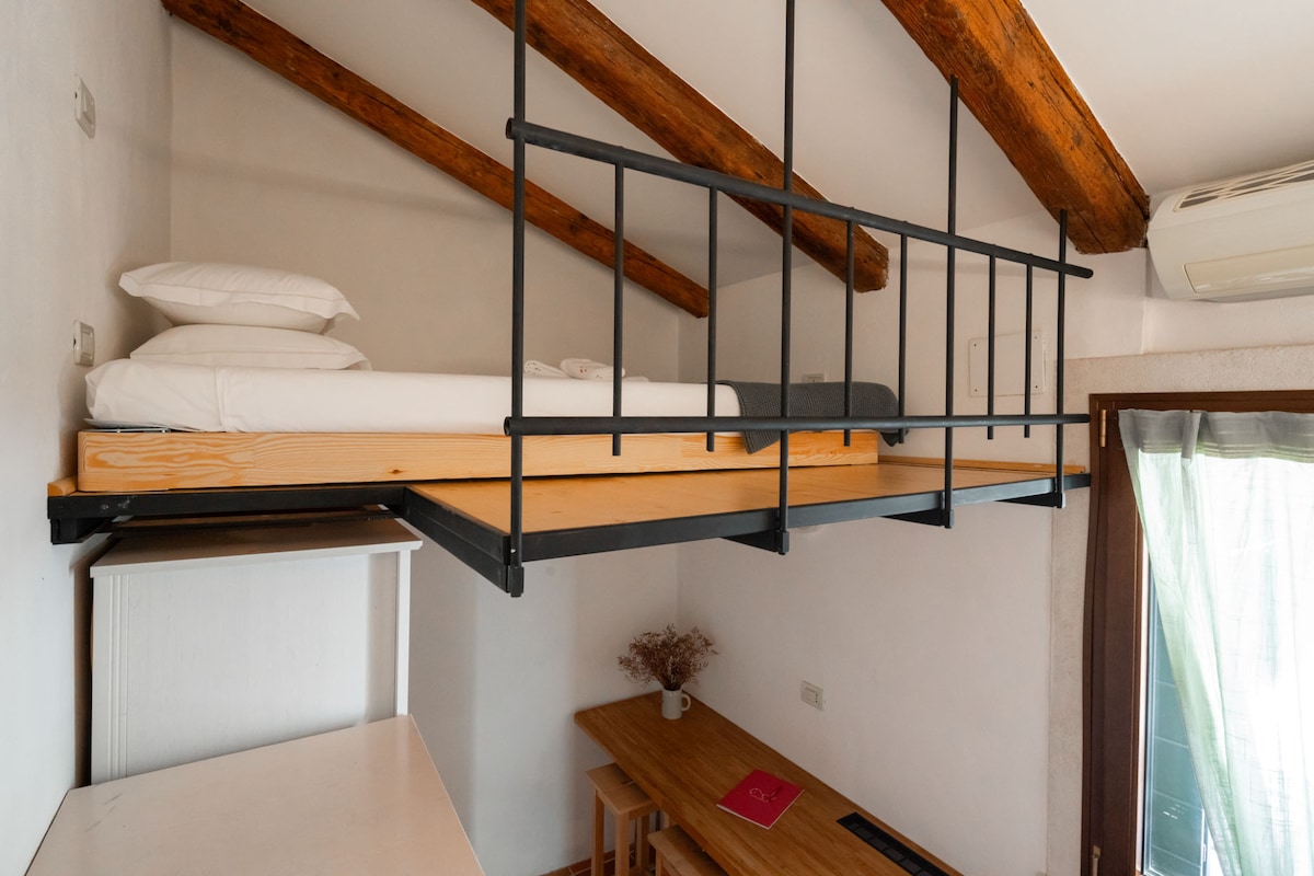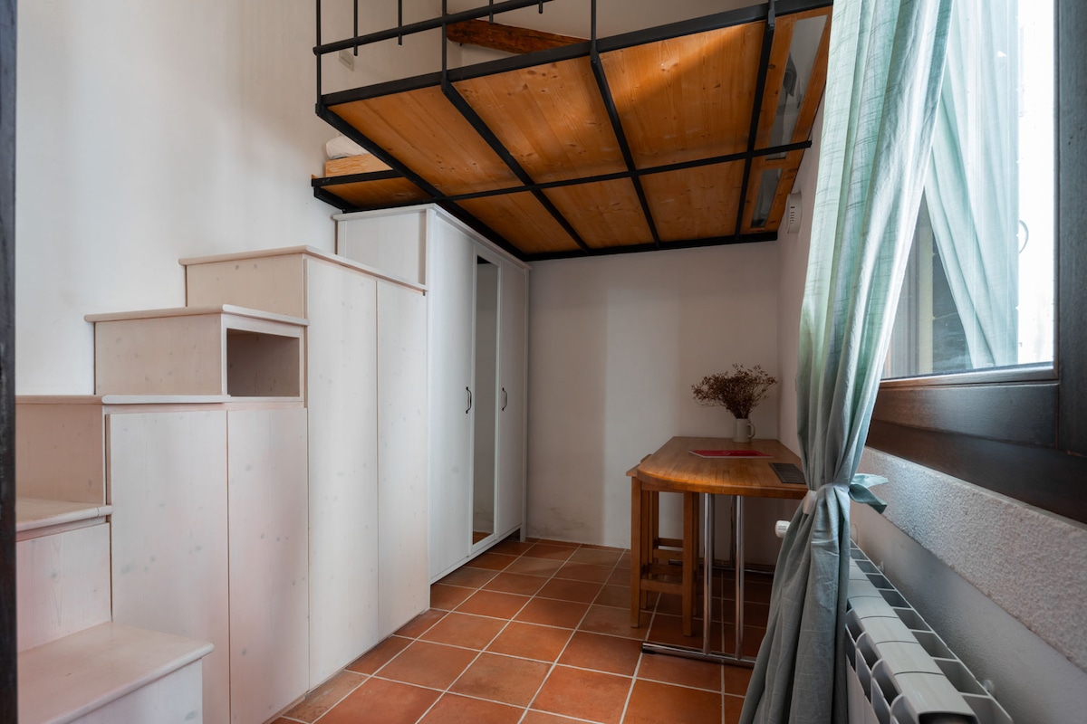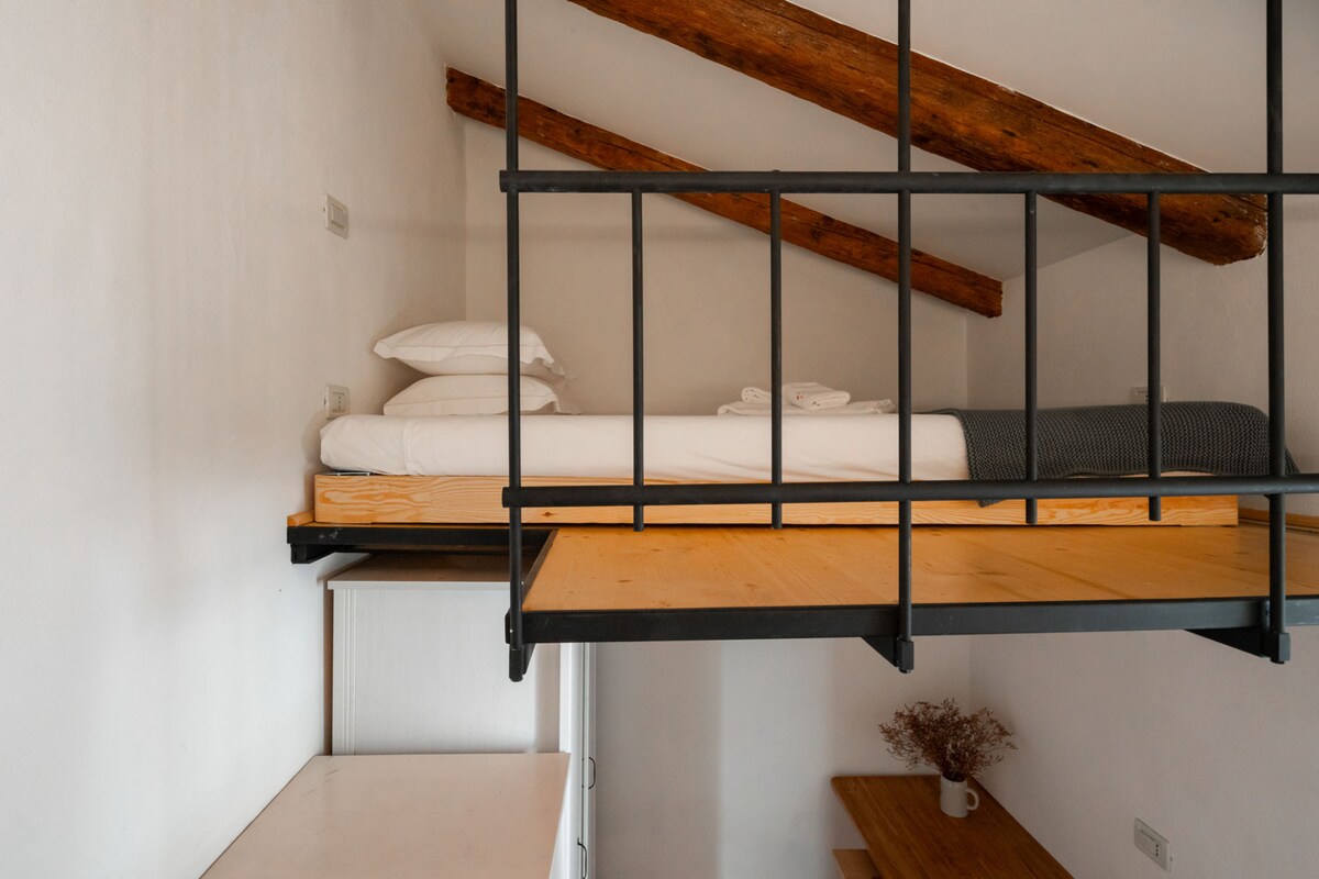 It develops with a large double bedroom, a full bathroom, and a living space with kitchen and dining. The extra room is as studio with a small attic where there is a mattress for young kids. There is also a half bathroom available for the guests.The courtyard is a public space with private use, that allows space in front of the house and natural light coming from the windows, Outside, there is a table with chairs on the landing of the apartment’s stairs that faces the courtyard where the guests can have breakfast or enjoy a glass of wine in the cool of the evening.