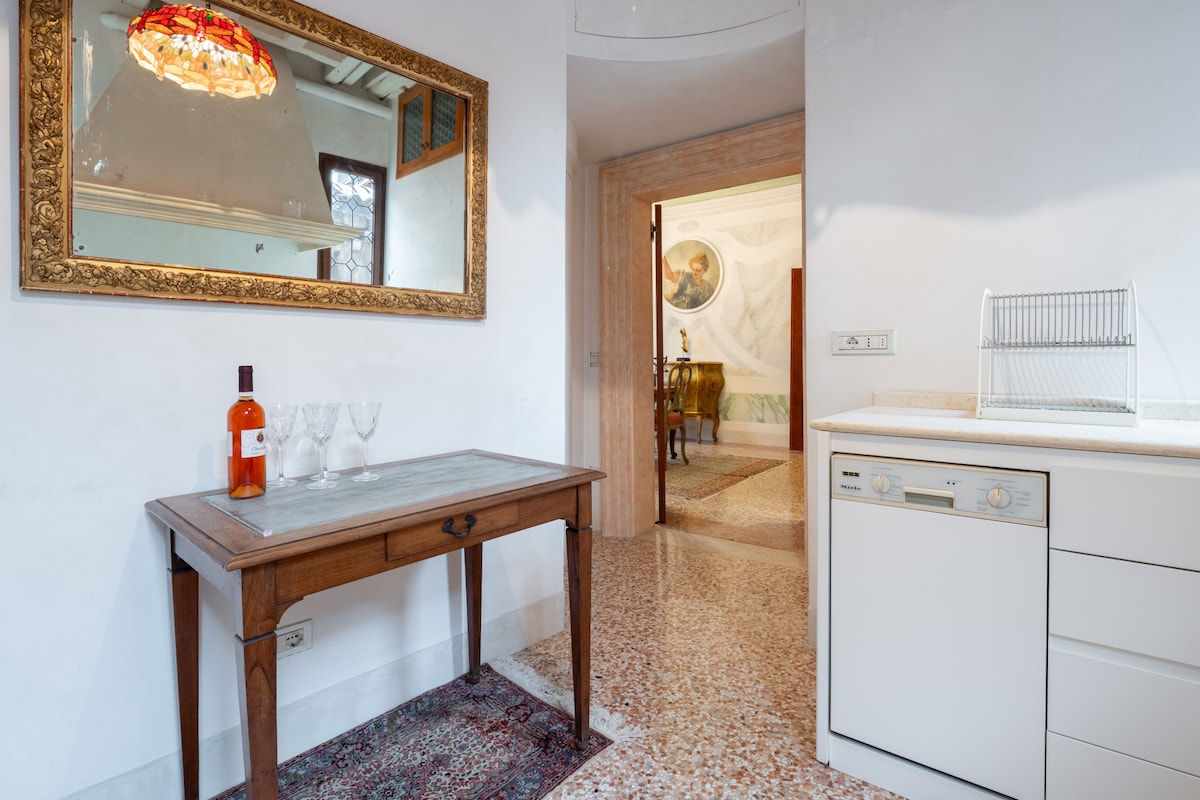 There are two double bedrooms and a bathroom with tub and shower. The apartment is on one floor with a living room and a dining room that can comfortably seat four guests. The kitchen is fully equipped and the luxurious furniture and decorations make it a very typical Venetian home. The porcelains in the master bedroom cover all walls with a hundred small shelves, one per statuette.Registration details