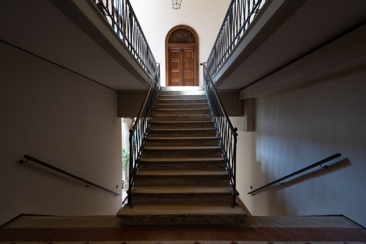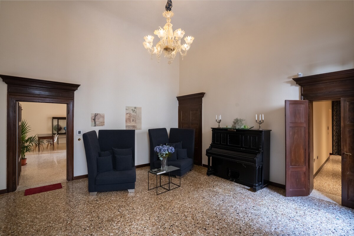 Cà Longo Palace is located on the first noble floor and you can access it through the elegant entrance hall, to whose side opens the characteristic internal courtyard an authentic well.A comfortable staircase with two ramps leads to the floor, from the first door on the left you enter the reception room illuminated by large windows, decorated with refined handmade curtains and a precious Murano blown glass chandelier. To capture the attention of guests are an old fireplace and its nineteenth-century mirror and an original auto plane of the 1920s.
