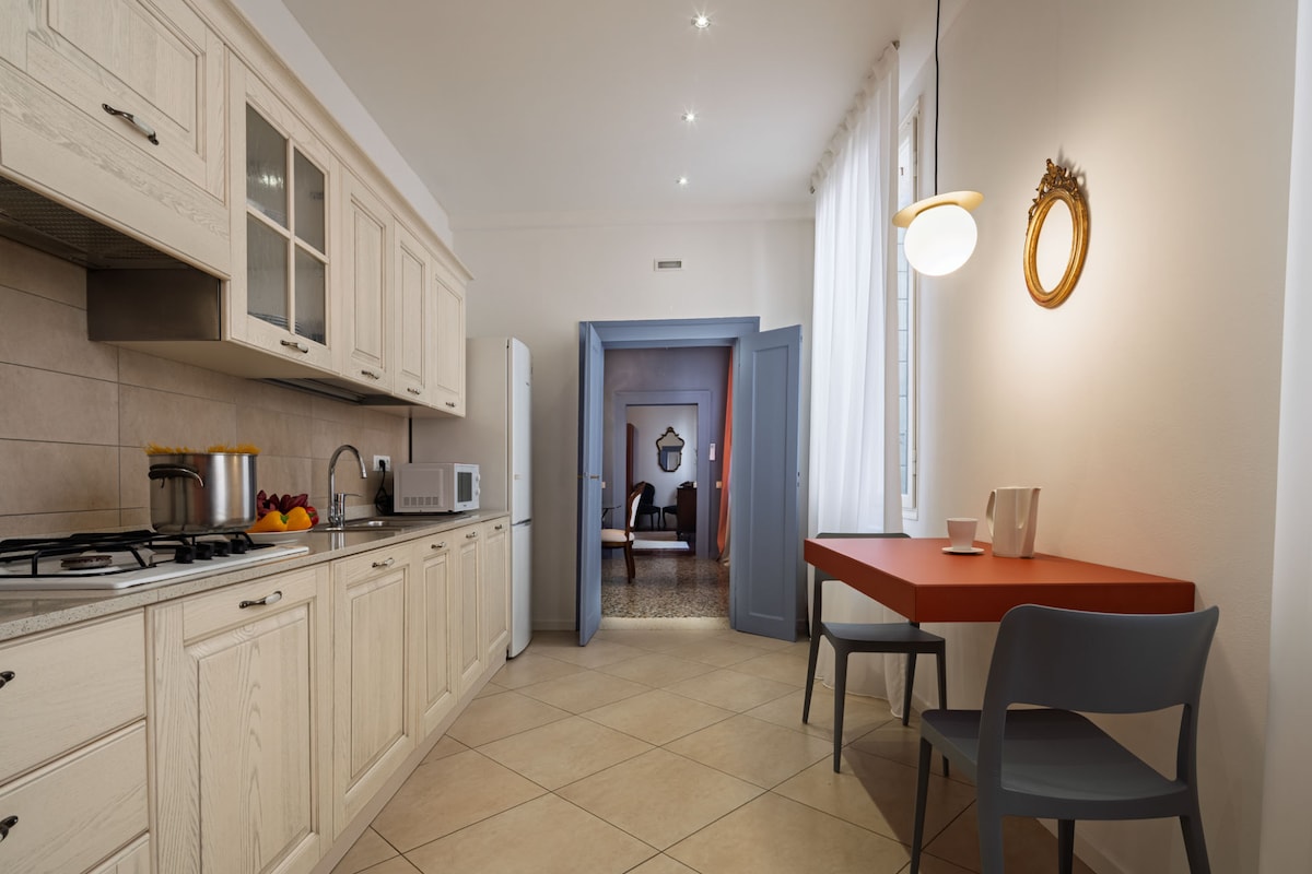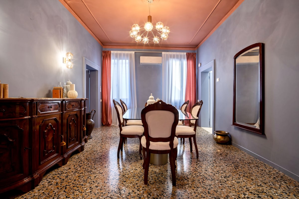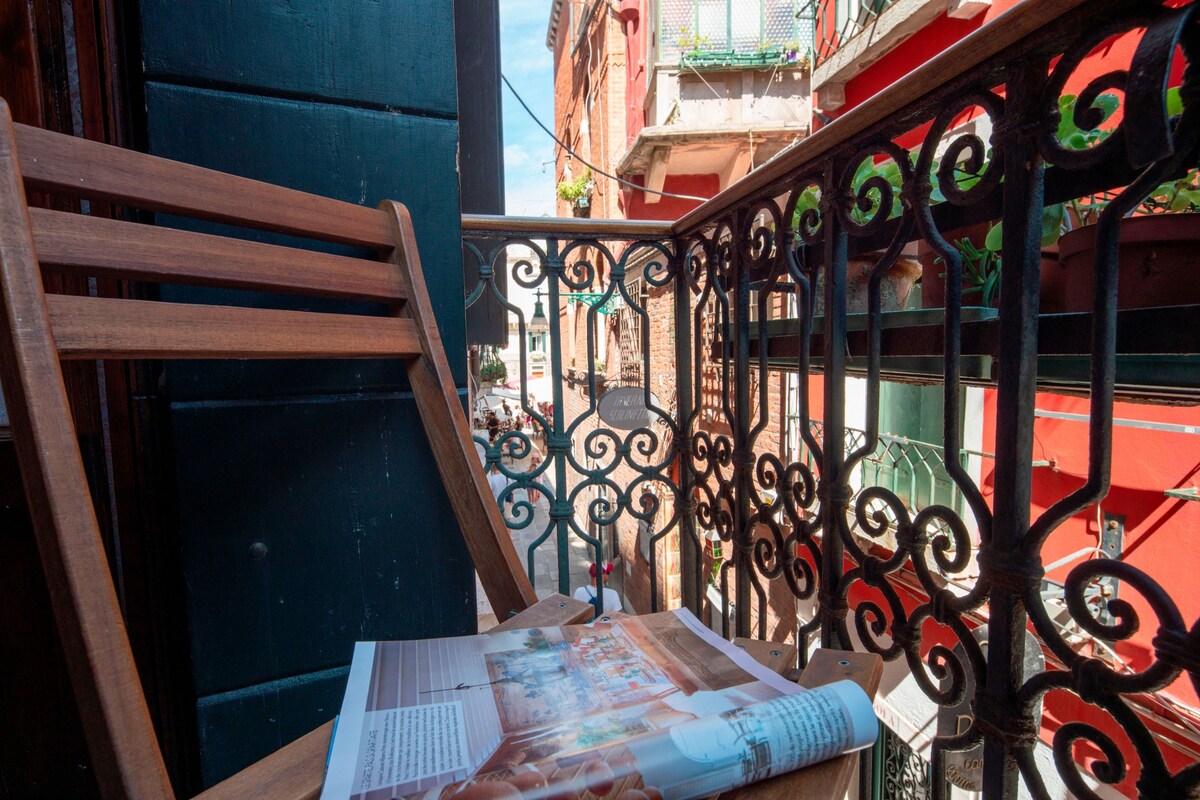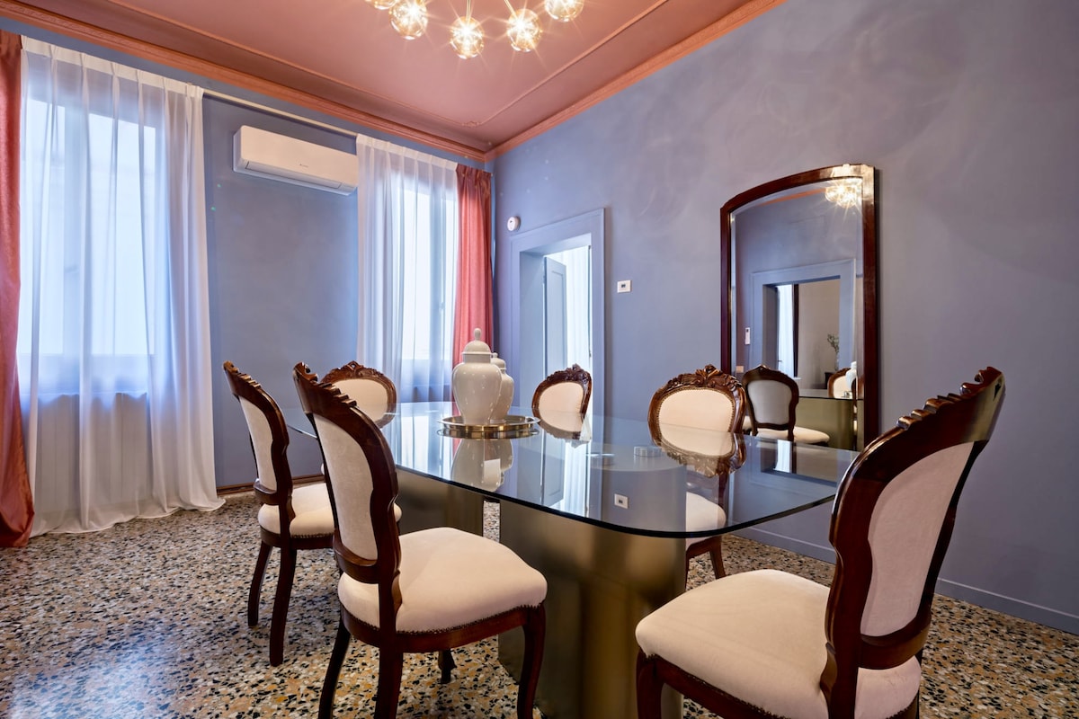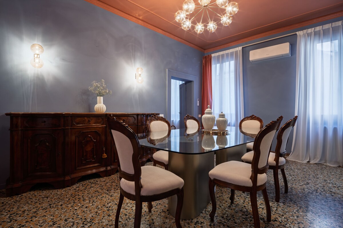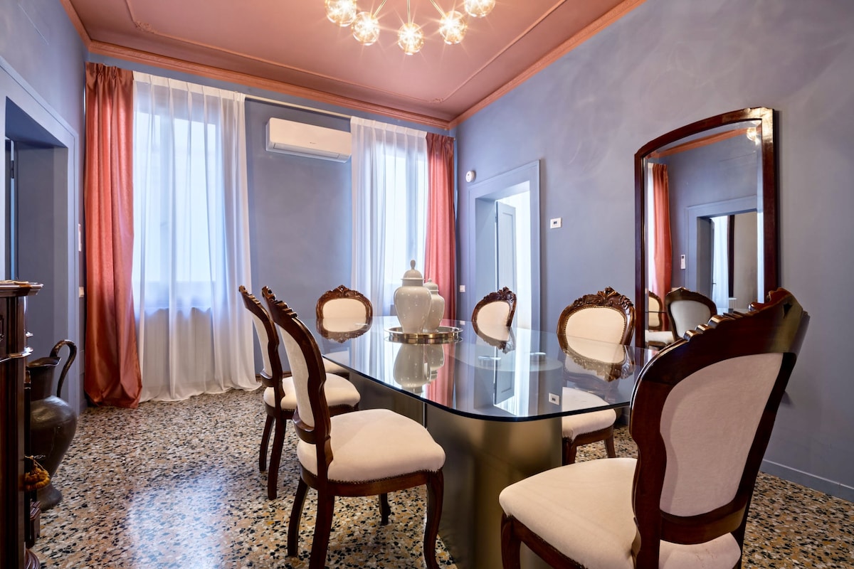 A bright apartment on the second floor, fully furnished in classic Venetian style.The apartment consists of a living area with a large windowed living room, presenting a small balcony overlooking the Venetian street below. The spacious dining room with antique furniture holds a table for 6-8 people. The two spaces of the living area are separated by a glass-paneled wall, which brings a lot of light to both.