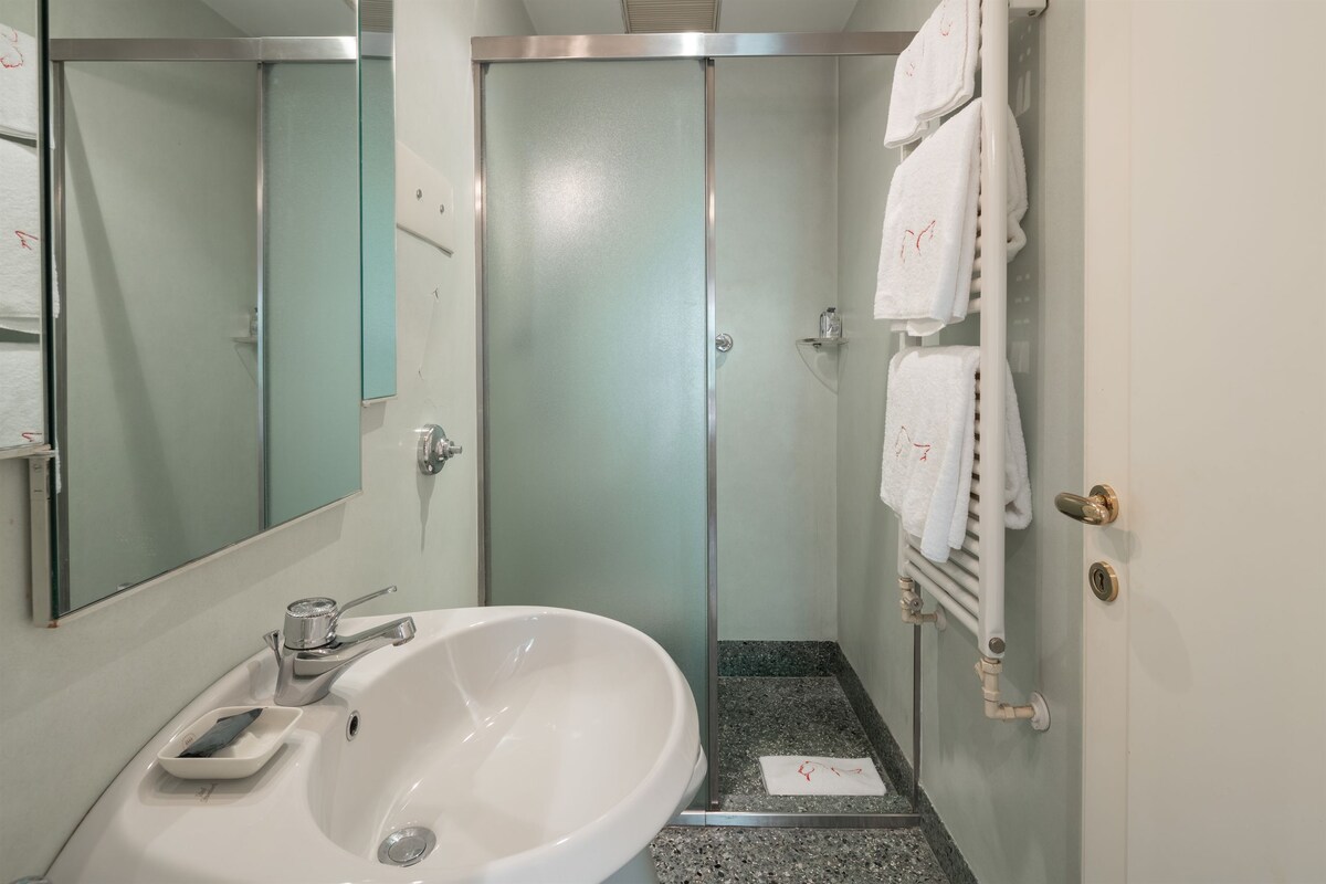 The hallway leads you to the double bedroom and to the 2 bathrooms (one with shower cabin and one with bathtub).The house is located in a lively area of the city, quite close to Piazza San Marco and many historical monuments. It is also near the main route for the Venetian Arsenal, which hosts the Art and Architecture Biennale. In the nearby area you can find various restaurants and cafes, as well as a well-stocked supermarket. The closest waterbus stop is San Zaccaria for easy and quick connections to all main attractions, as well as for the Alilaguna boat service for the Marco Polo Airport (Red Line and Blue Line).Registration details