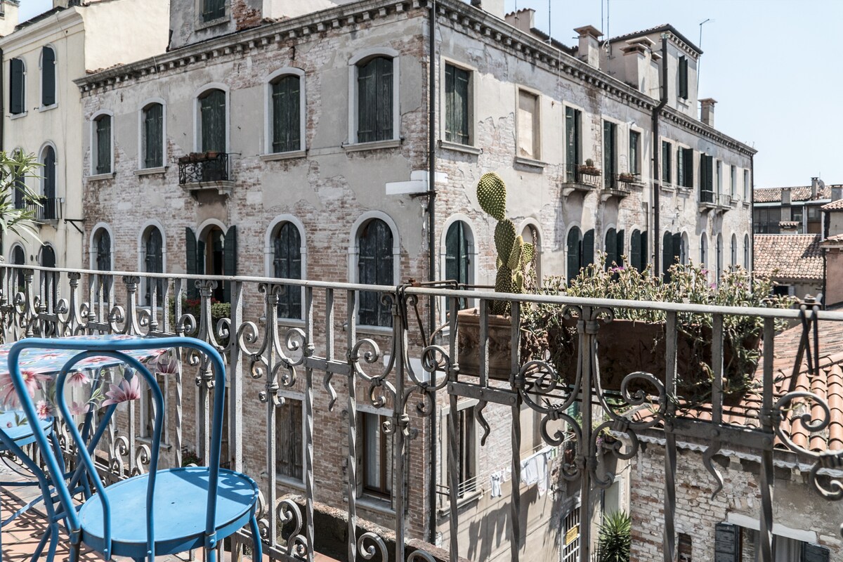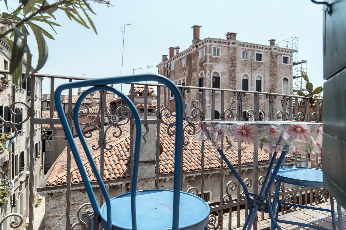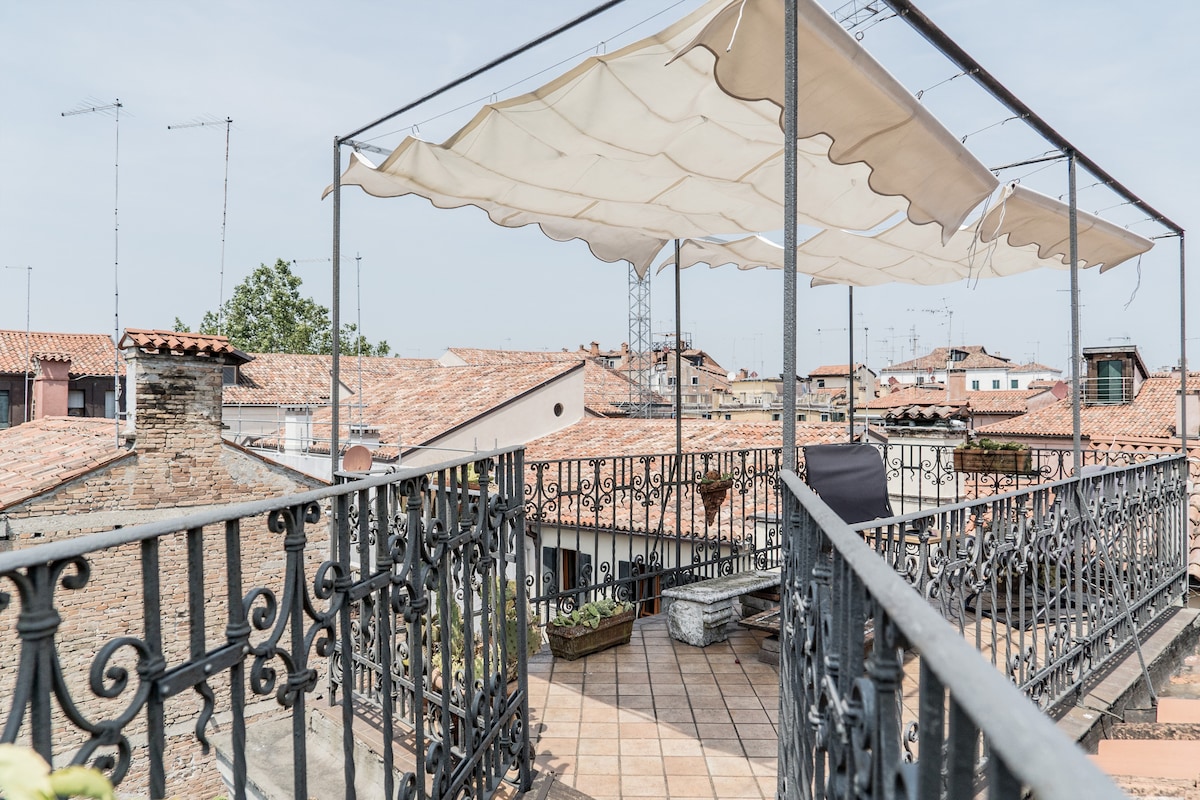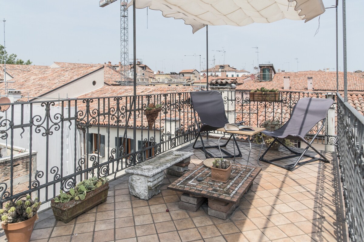 Unique apartment in Venice with 3 terraces facing the roofs of Venice and canalsVery bright one bedroom apartment with: canal View, air conditioning, Wi-Fi and three lovely terraces. This apartment is situated off Campo San Giacomo dall’Orio, in the Santa Croce district and it is at about 10 minutes’ walking from the railway station and Piazzale Roma (car parks and bus stations). A large double bedroom and a double sofa bed allow a romantic escape or a small family holiday. Near the groceries and excellent restaurant you will be able to enjoy the Campos’ life and retire in a very quiet spot.