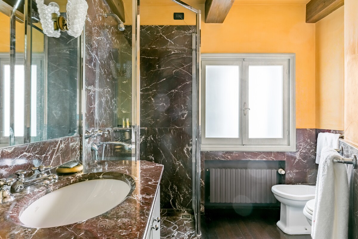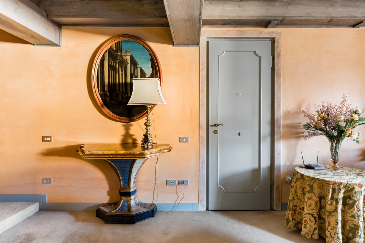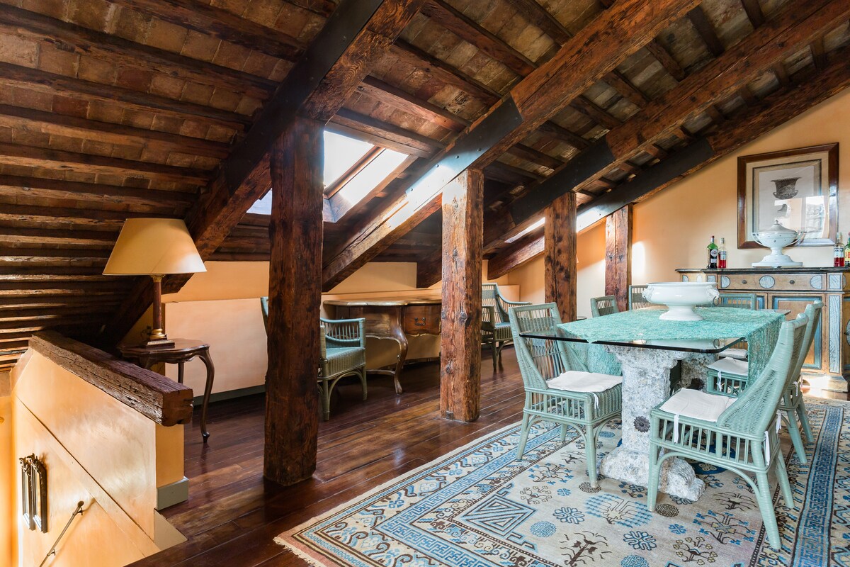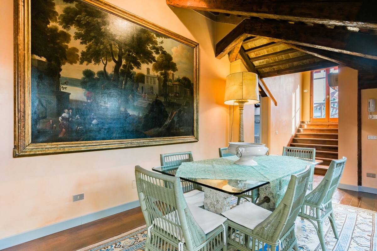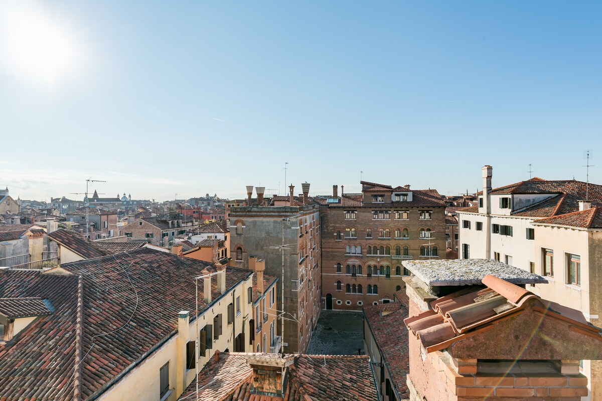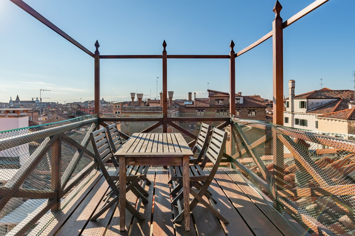 This fantastic apartment is on the fourth floor of an antique palace in the San Marco Quarter. 2 double bedrooms and 2 full bathrooms, exquisite furniture and a lovely terrace and dining room on the top floor. The Penthouse face all sides of the palace and it is furnished with central air conditioning, Wi-fi and all modern commodities. The Large and bright living room can sit 8 persons and the dining room has seating for 8 as well. The terrace is equipped with armchairs and a table where you can dine and sunbath. This is the second living room for about 7 month a year. The bedrooms are queen size and the gold up canopy with the exquisite 17th and 18th century furniture give a character to the rooms that is unique.The bathrooms are in marble and the kitchen is fully equipped also for professional cooks. The apartment can be reached via stairs or a lift and the proximity with the Sant’Angelo vaporetto is extremely convenient for Alilaguna Airport shuttle boat and vaporetto Line 1.