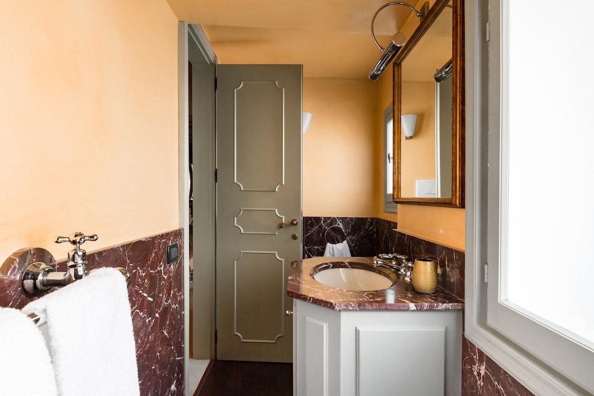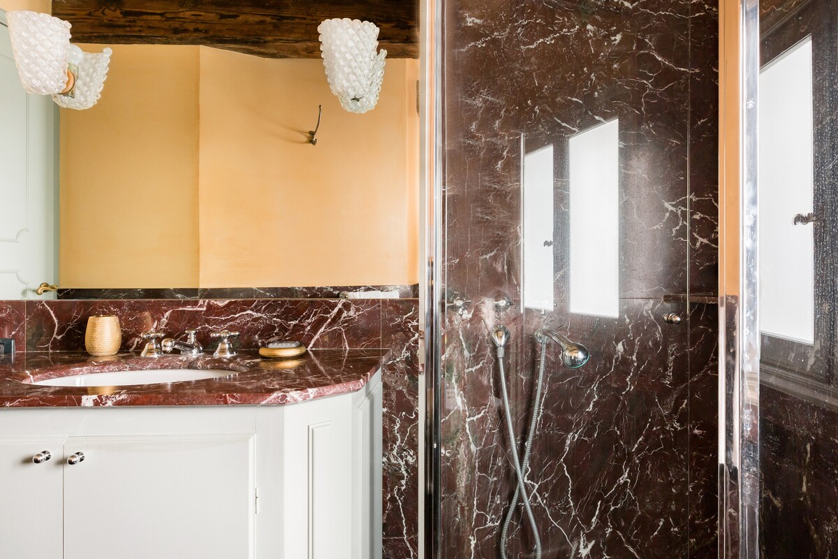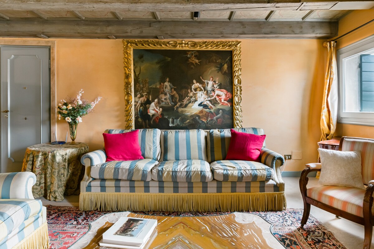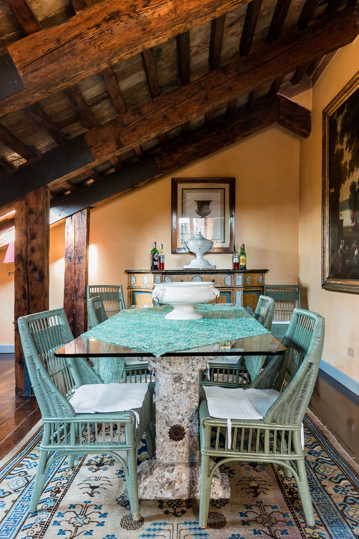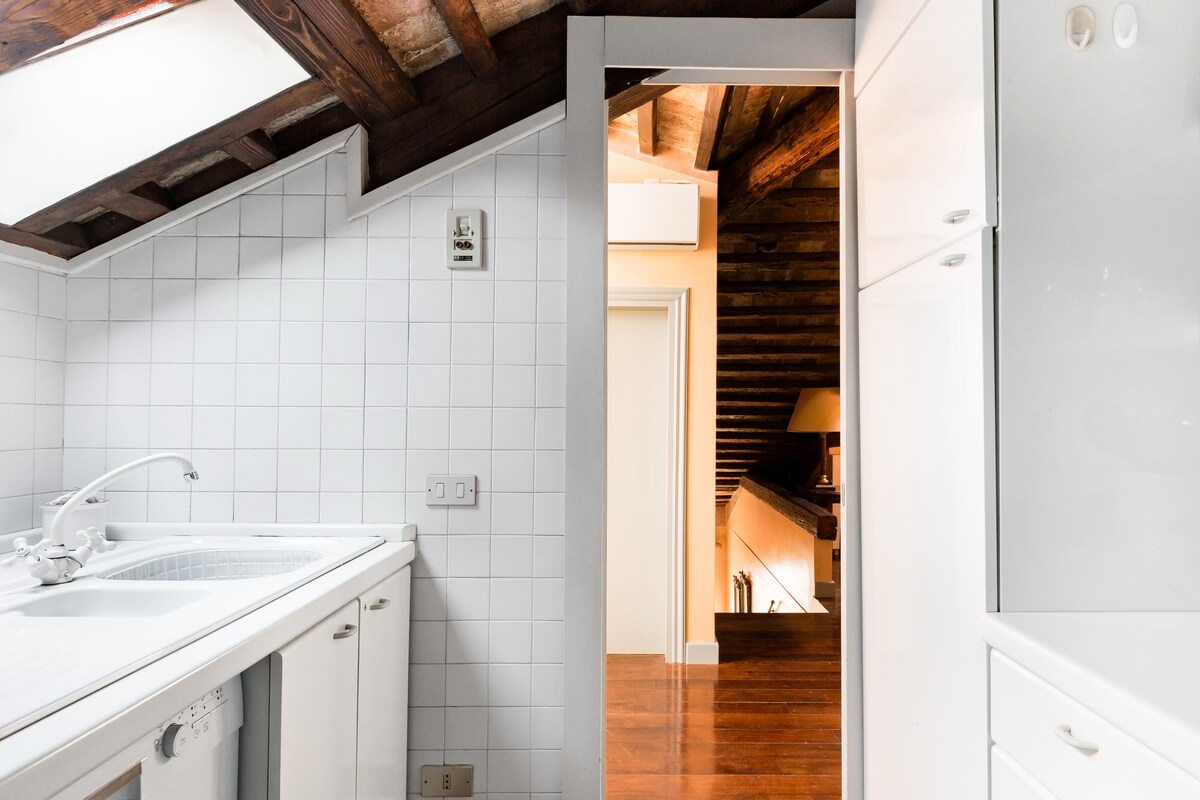 This fantastic apartment is on the fourth floor of an antique palace in the San Marco Quarter. 2 double bedrooms and 2 full bathrooms, exquisite furniture and a lovely terrace and dining room on the top floor. The Penthouse face all sides of the palace and it is furnished with central air conditioning, Wi-fi and all modern commodities. The Large and bright living room can sit 8 persons and the dining room has seating for 8 as well. The terrace is equipped with armchairs and a table where you can dine and sunbath. This is the second living room for about 7 month a year. The bedrooms are queen size and the gold up canopy with the exquisite 17th and 18th century furniture give a character to the rooms that is unique.The bathrooms are in marble and the kitchen is fully equipped also for professional cooks. The apartment can be reached via stairs or a lift and the proximity with the Sant’Angelo vaporetto is extremely convenient for Alilaguna Airport shuttle boat and vaporetto Line 1.